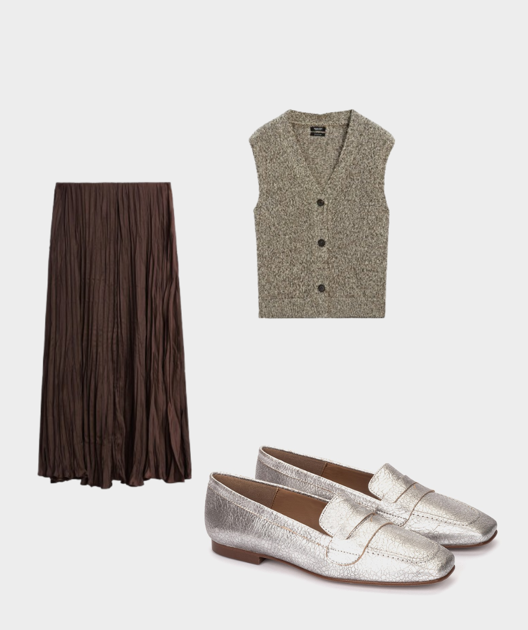 Y si lo tuyo son los estampados, una falda de cuadros en tonos oscuros puede ser la elección perfecta para los días de otoño. Los mocasines, en este caso, aportan ese toque sofisticado que eleva el conjunto sin esfuerzo.