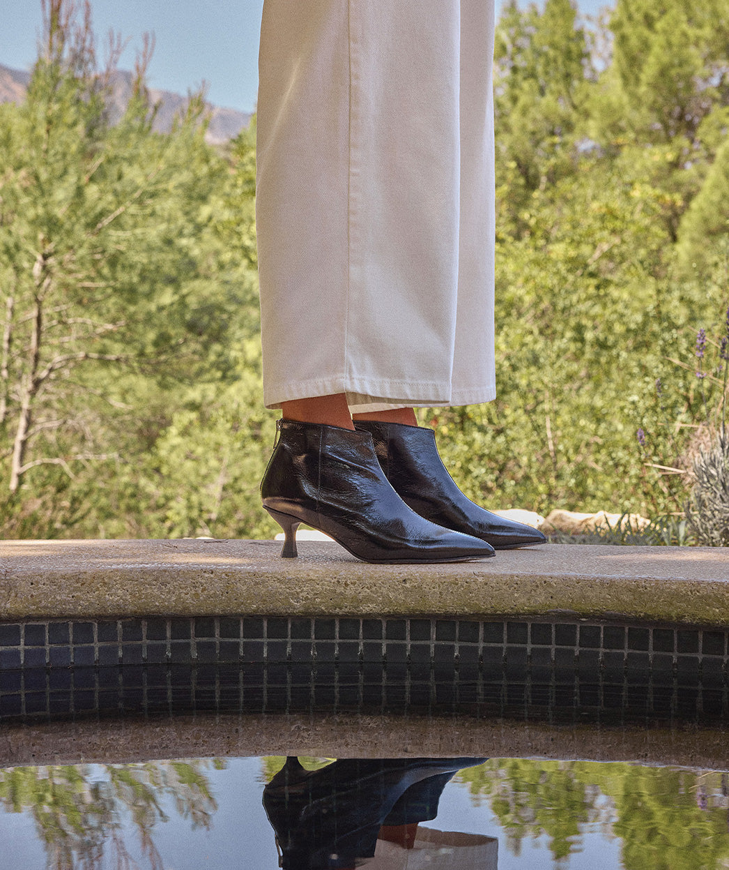 Para un look más casual, puedes combinar unos botines negros planos con unos jeans estrechos y una camiseta básica. Si buscas algo más formal, elige unos pantalones de vestir y unos botines de tacón. Este conjunto es ideal tanto para el trabajo como para una cena informal.