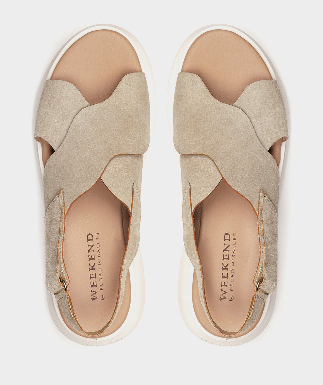 Flache Sandalen aus beigem Spaltleder. Mit wellenförmigem Crossover-Vamp und einem bequemen, modernen Plateau für ein einzigartiges, futuristisches Aussehen. Egal, ob du durch die Stadt schlenderst oder einen entspannten Tag am Strand genießt, diese Sandalen werden zu deinem Lebensstil passen.