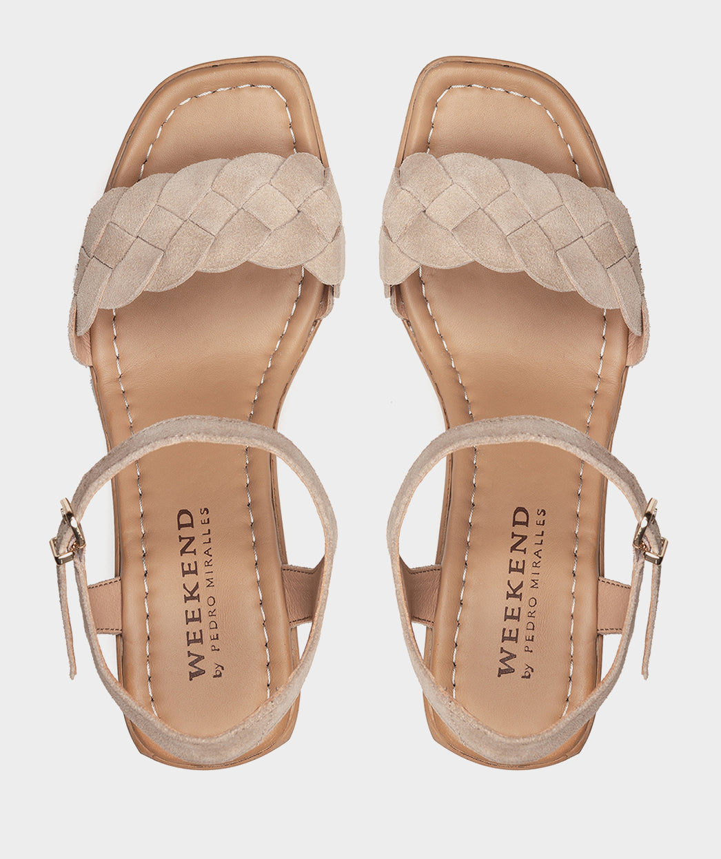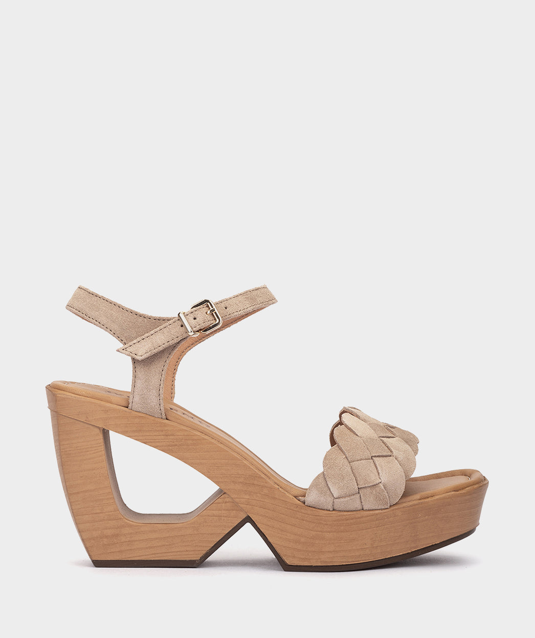 Lederfarbene Sandalen aus Spaltleder. Hergestellt mit einem skulpturalen Absatz in Holzoptik und einem geflochtenen Obermaterial, das Ihren Füßen einen Hauch von Eleganz verleiht. Diese Sandalen entführen Sie in eine Welt, in der Mode mit Kunst verschmilzt.