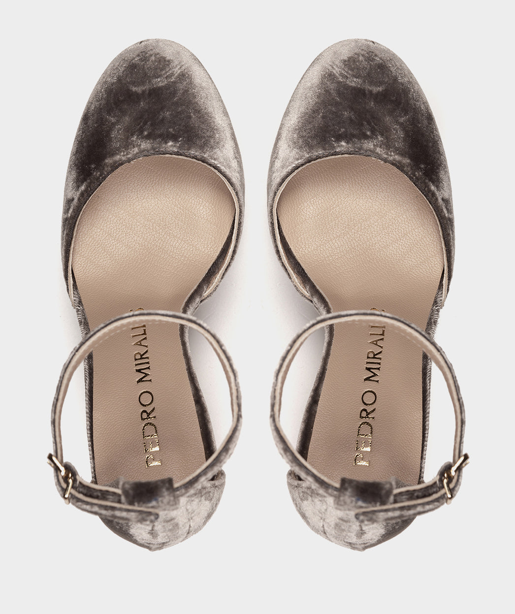 Sandalen mit Plateauabsatz aus grauem Samt. Die geschlossene Spitze der Lena-Sandalen ist sehr elegant, sie bedeckt Ihre Zehen und bringt einen Hauch von Geheimnis und einen raffinierten Stil.