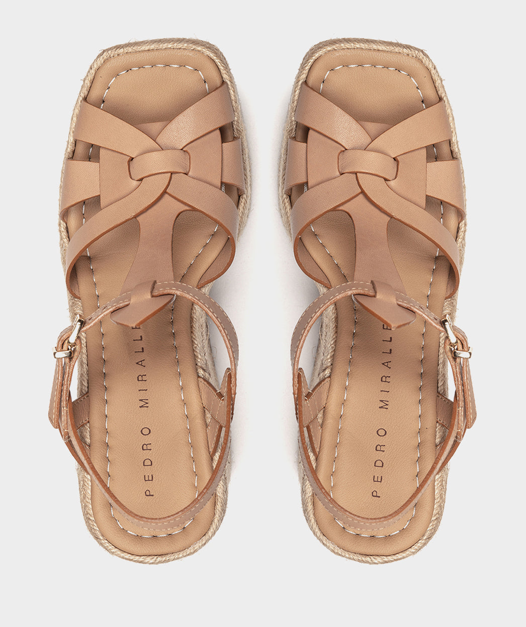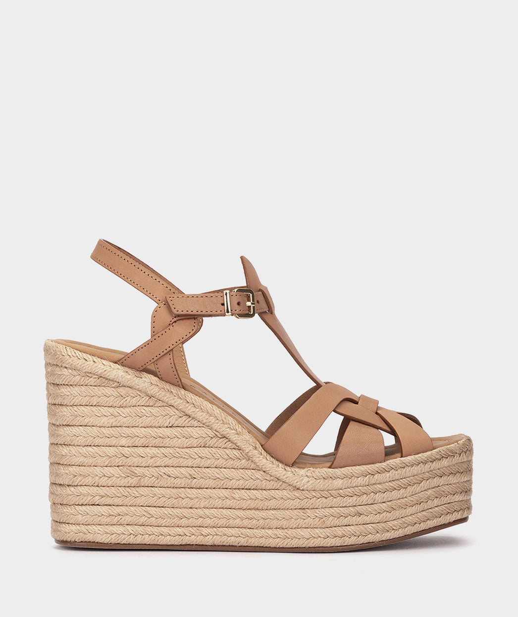 Wedges mit karamellfarbenem Lederplateau. Aus Leder mit ineinander verschlungenen Riemen, die auf einem gefütterten Espadrille-Keilabsatz ruhen. Tabarca-Espadrilles sind ein Must-have für den Sommer.