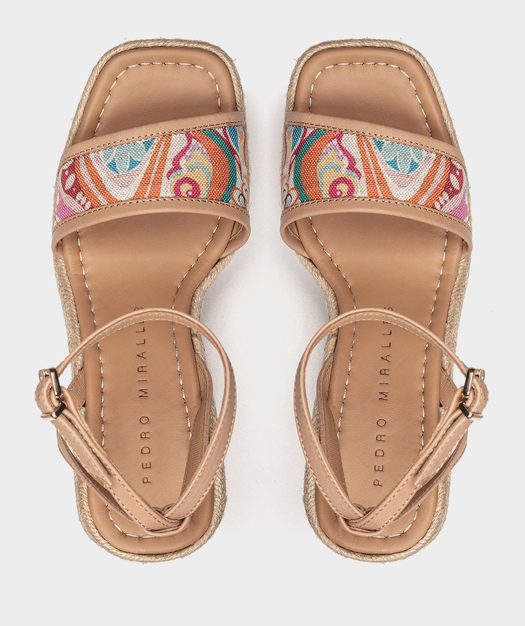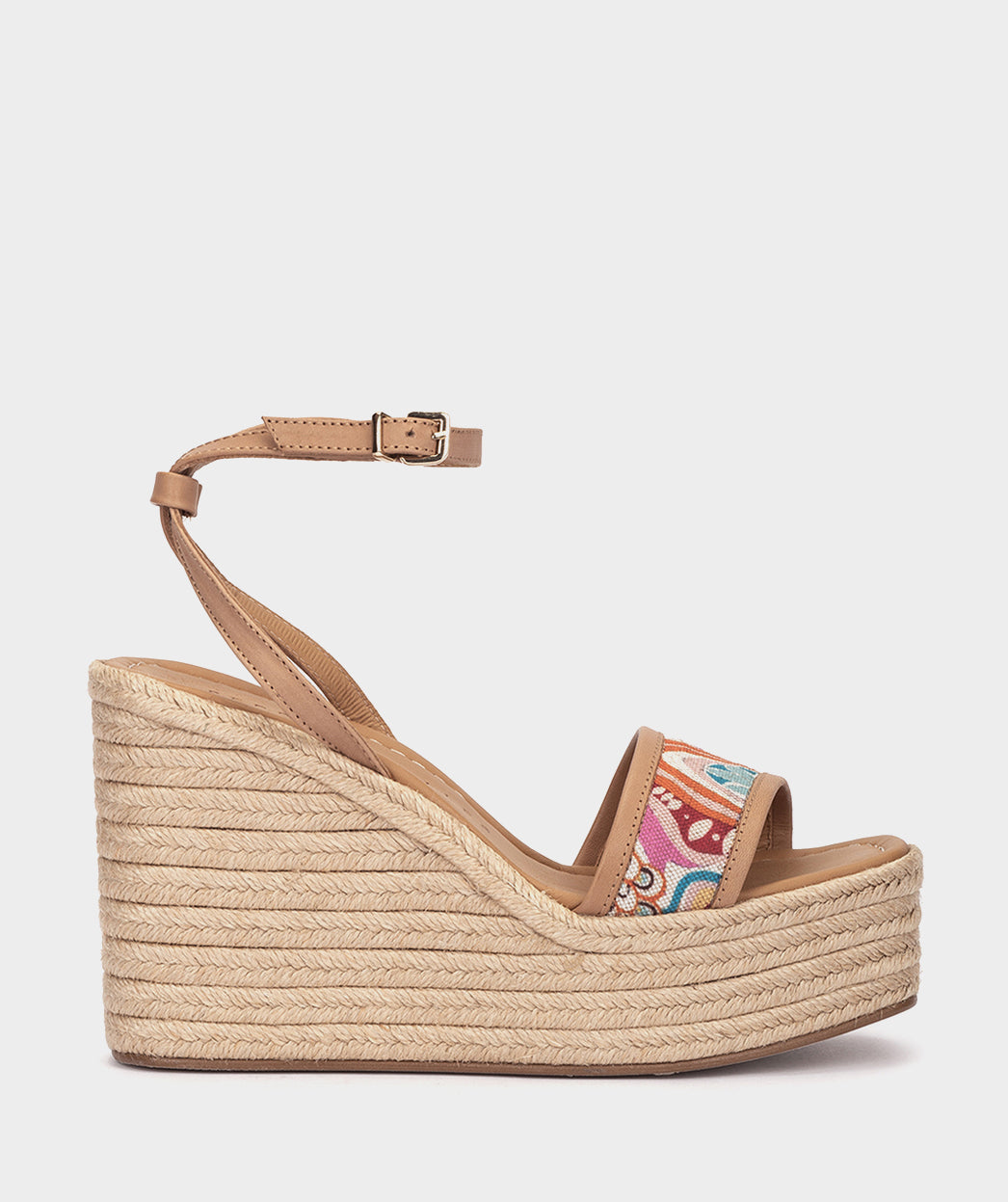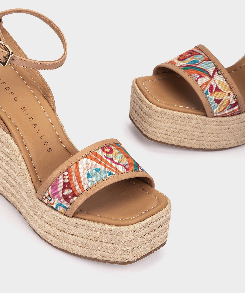 Wedges mit Lederplateau und bedrucktem Stoff. Der Fantasiestoff bildet komplizierte Muster und schillernde Details, die die Sinne wecken. Mit Peniche-Wedges ist jeder Schritt ein Style-Statement.
