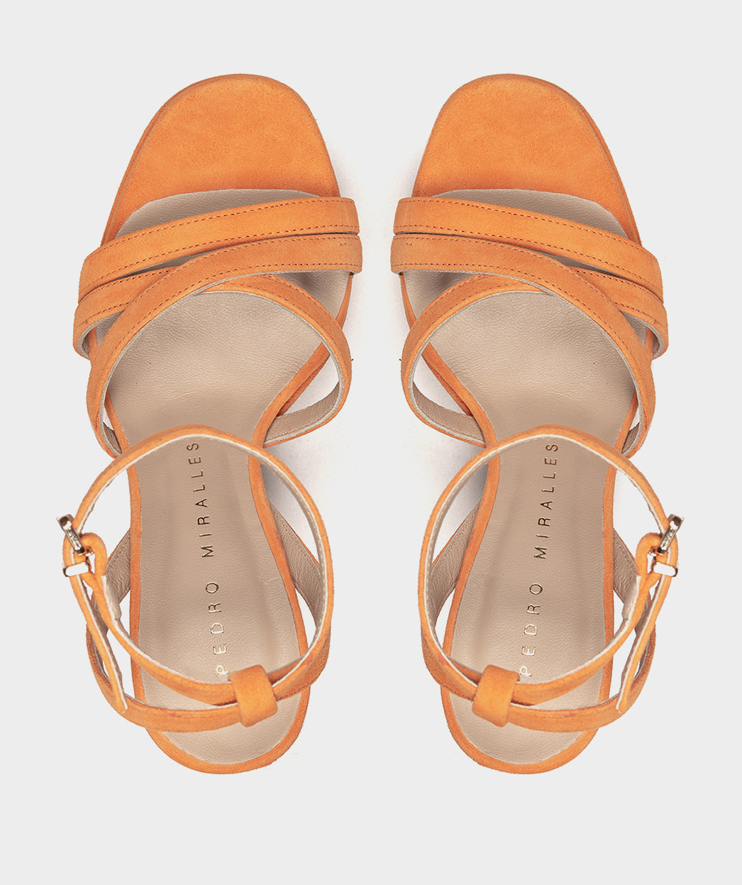Sandaletten aus orangefarbenem Wildleder. CIVITELLA-Sandalen zeichnen sich durch ihr elegantes Design aus. Die Kombination der Riemen am Obermaterial mit dem Retro-Absatz und dem Plateau verleiht dem Modell Persönlichkeit. Es wird Ihr bester Verbündeter bei Ihren nächsten Events der Saison sein.