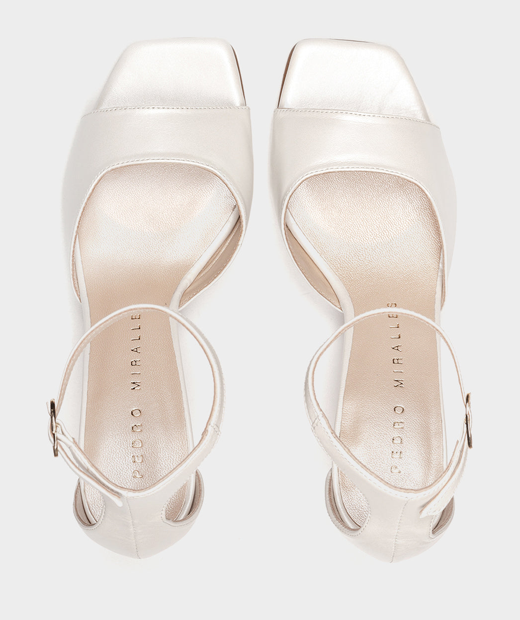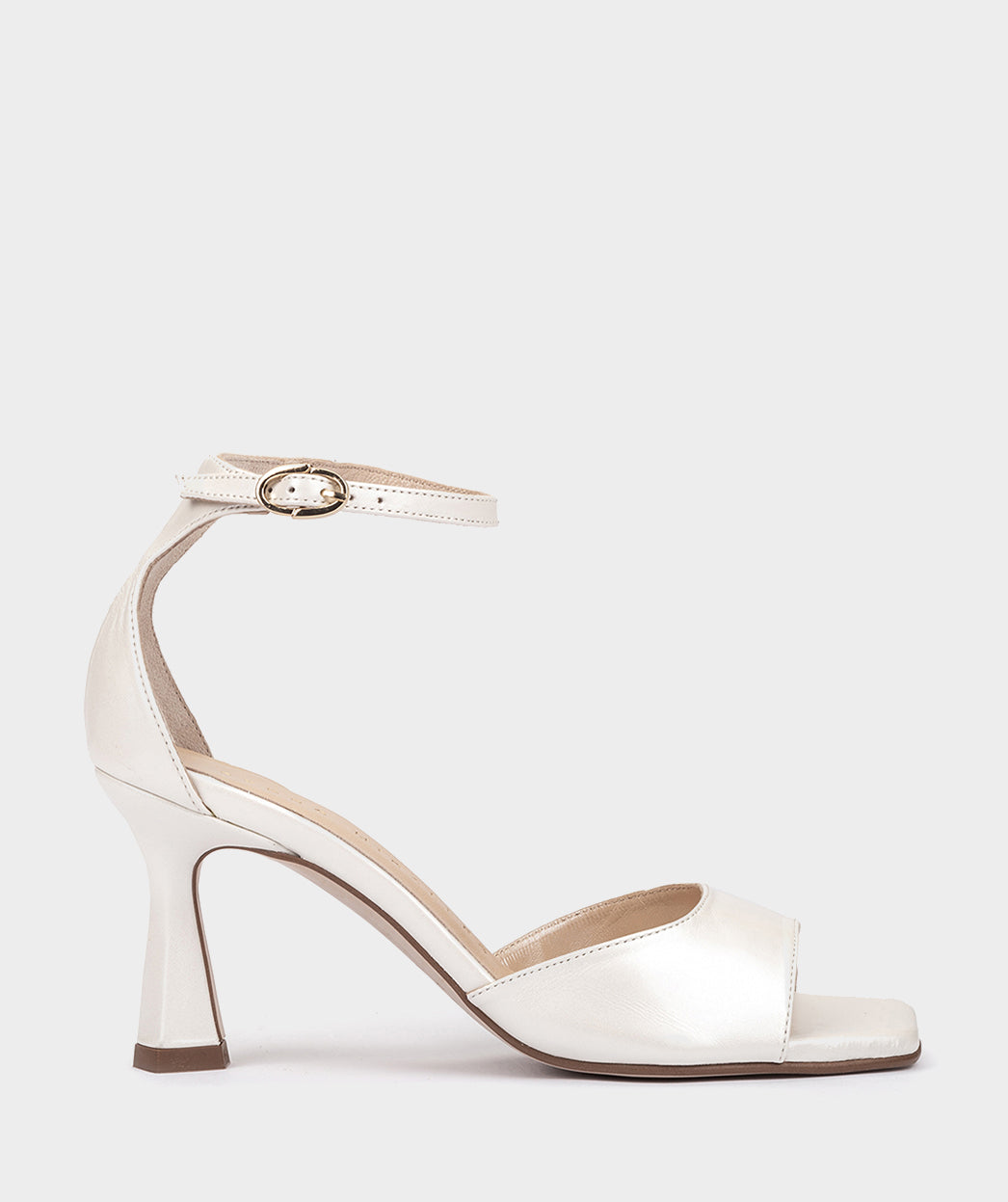 Sandalen aus perlweißem Leder mit Absatz. Stellen Sie sich eine einfache Sandale vor, aber voller Stil, das ist das Modell Alayor. Das perfekte Modell, das Eleganz und Einfachheit vereint.
