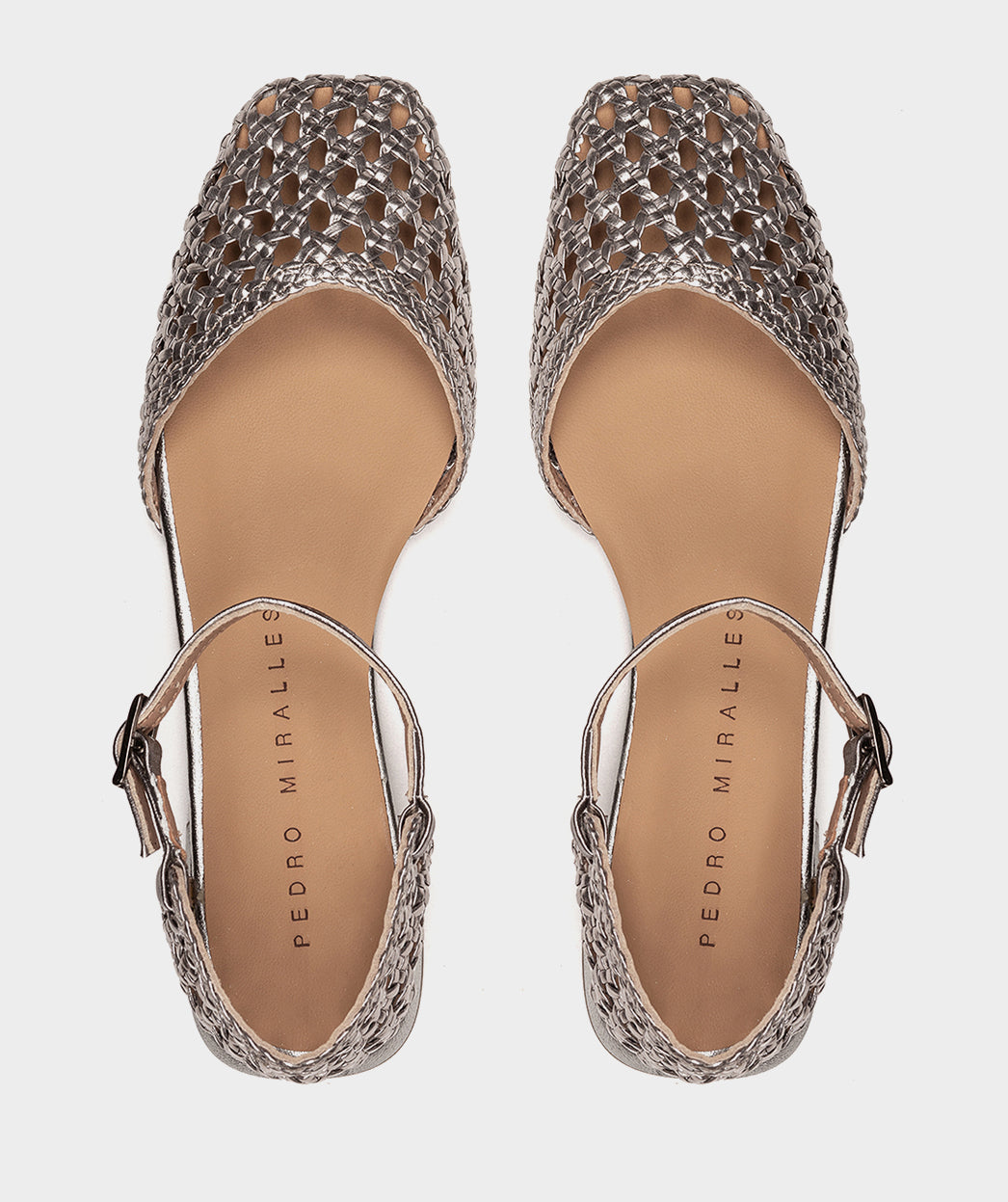 Stahlfarbene geflochtene flache Schuhe aus Metall. Egal, ob Sie durch die Stadt spazieren oder einen Tag am Strand genießen, das Modell Santorini ist die ideale Option für alle, die bei ihren Schuhen die perfekte Kombination aus Eleganz und Handwerkskunst suchen.