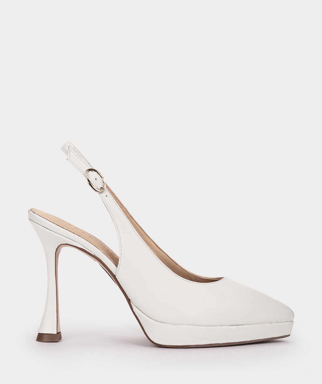 Slingback-Plateau-Absätze aus weißem Leder. Das Modell Rena ist eine neue Version unserer legendären Pumps, die Ihnen elegante Höhe bietet, ohne auf Komfort zu verzichten.