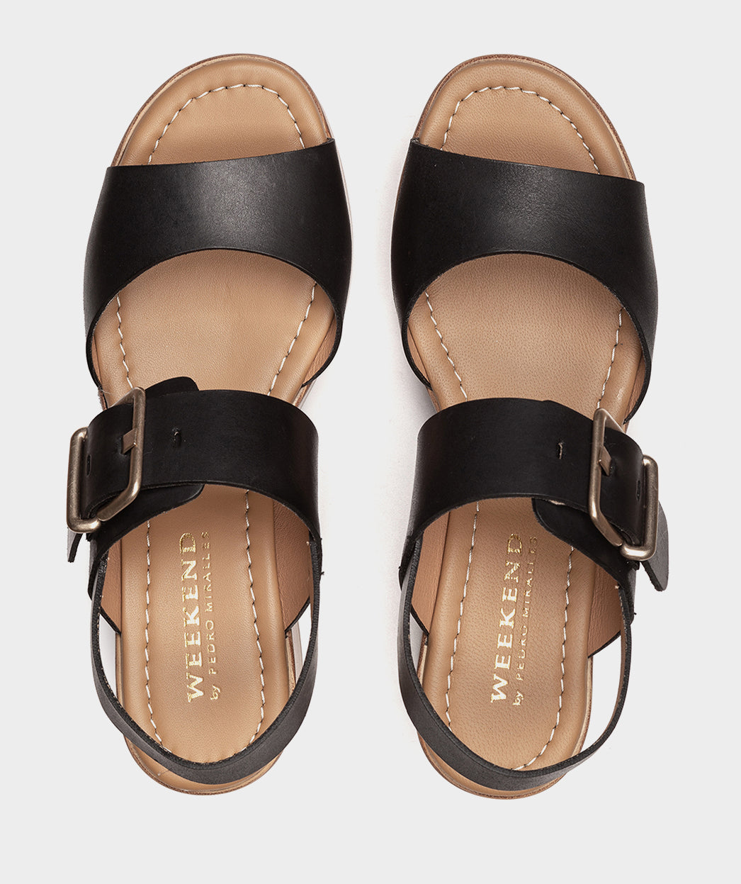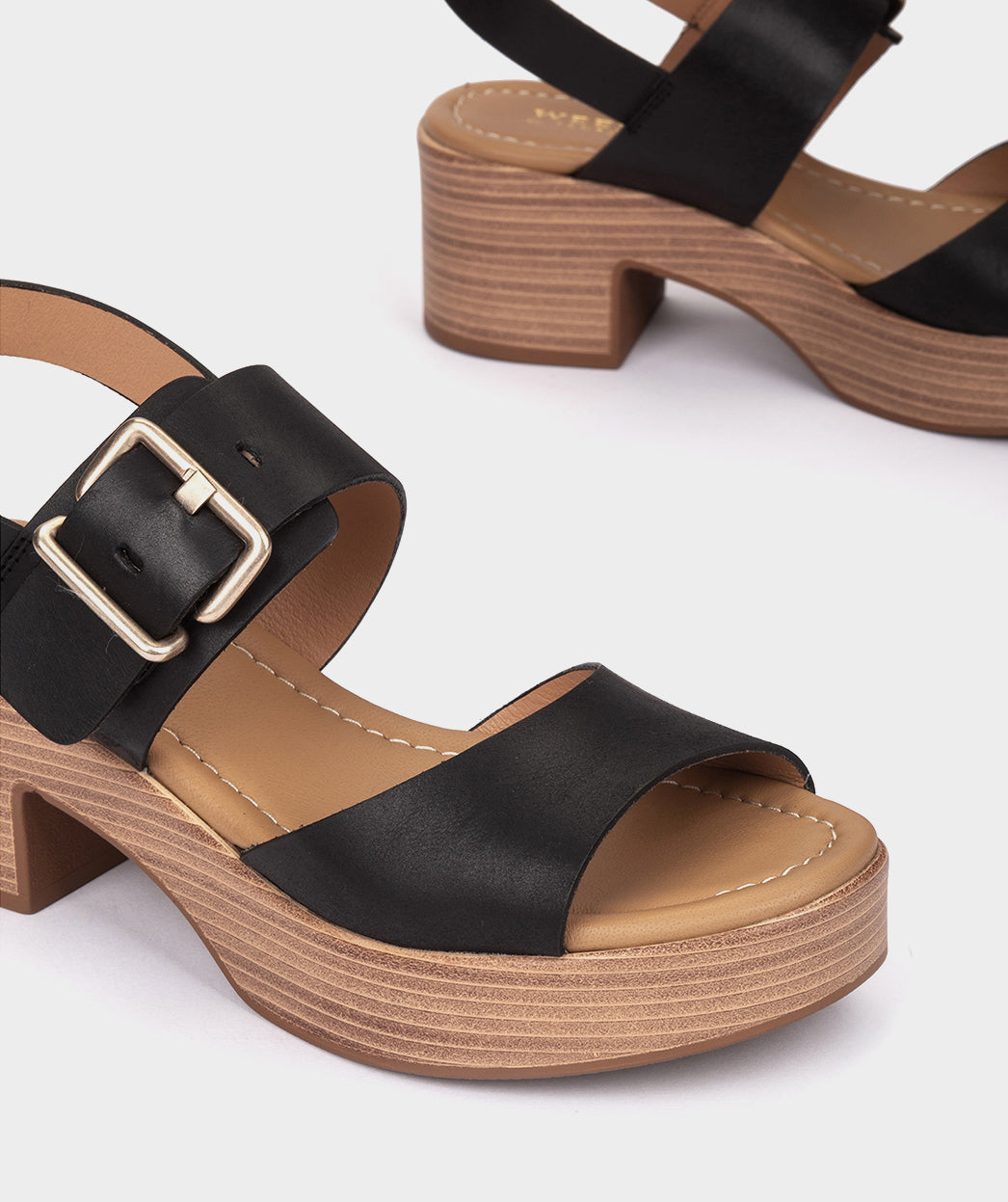 Schwarze Ledersandalen mit Absatz. Ein zeitloses und vielseitiges Modell. Perfekt für Liebhaber von Komfort, für die das Detail der Schnalle wichtig ist und unseren Schritten den perfekten Hauch von Eleganz verleiht.
