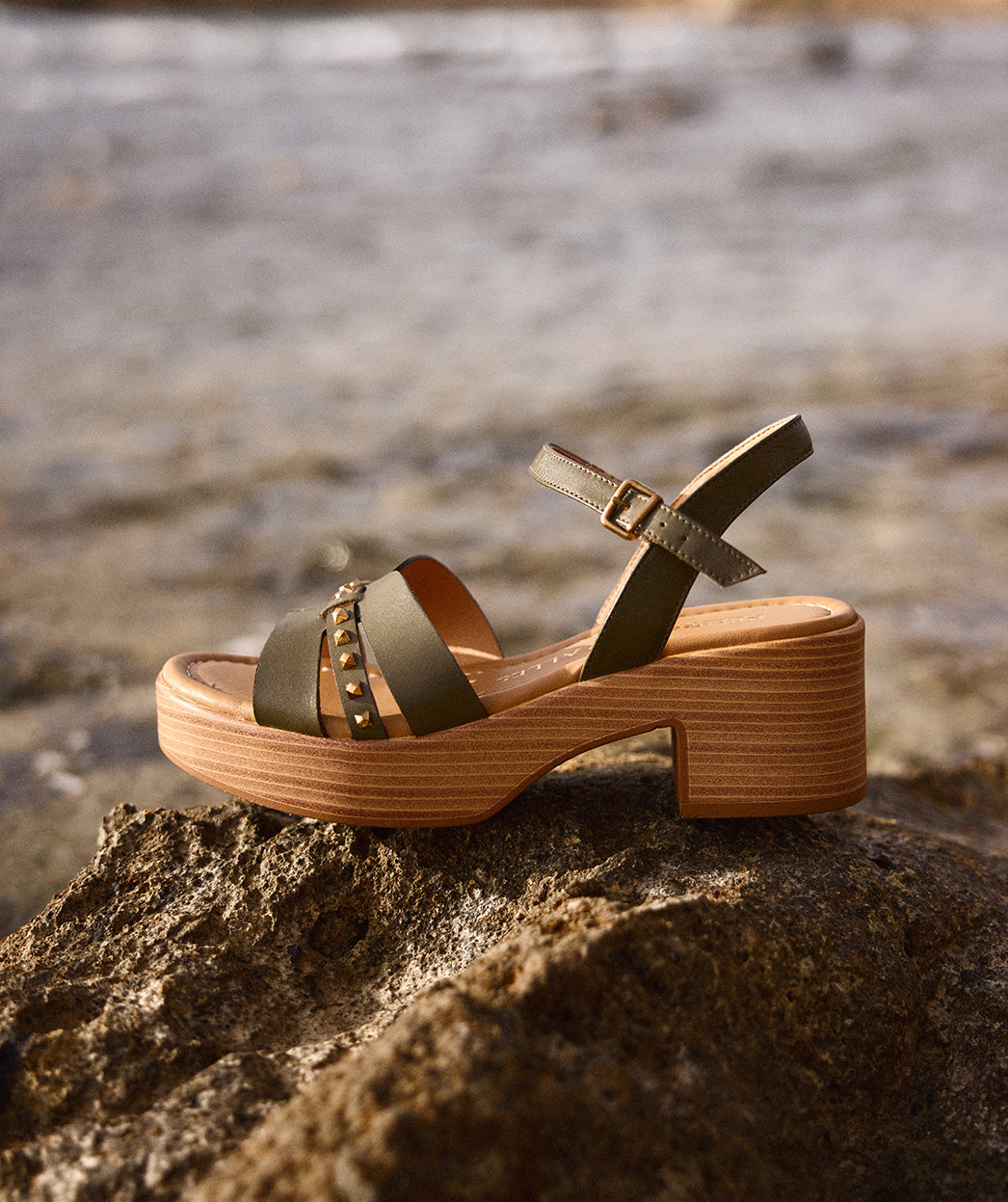 Khakigrüne Ledersandalen. Dieses Modell wird in dieser Frühling-Sommer-Saison zu einem Ihrer Favoriten werden. Die Nietenkombination verleiht ihr eine tolle Persönlichkeit, die diese Sandale einzigartig macht. Das Modell NEILA dürfen Sie diesen Sommer nicht verpassen.