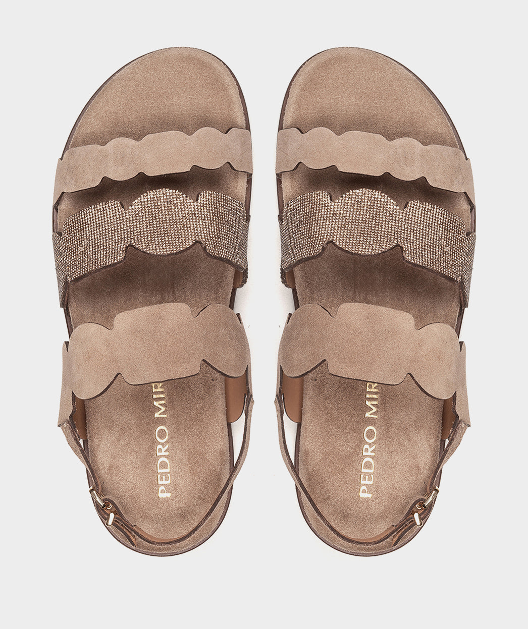 Flache braune Wildledersandalen mit Glitzer. Ein Modell, das für den täglichen Gebrauch konzipiert ist. Sein Obermaterial bietet optimalen Halt und Komfort beim Gehen. Cuetna mit Schnallenverschluss für eine bessere Passform.