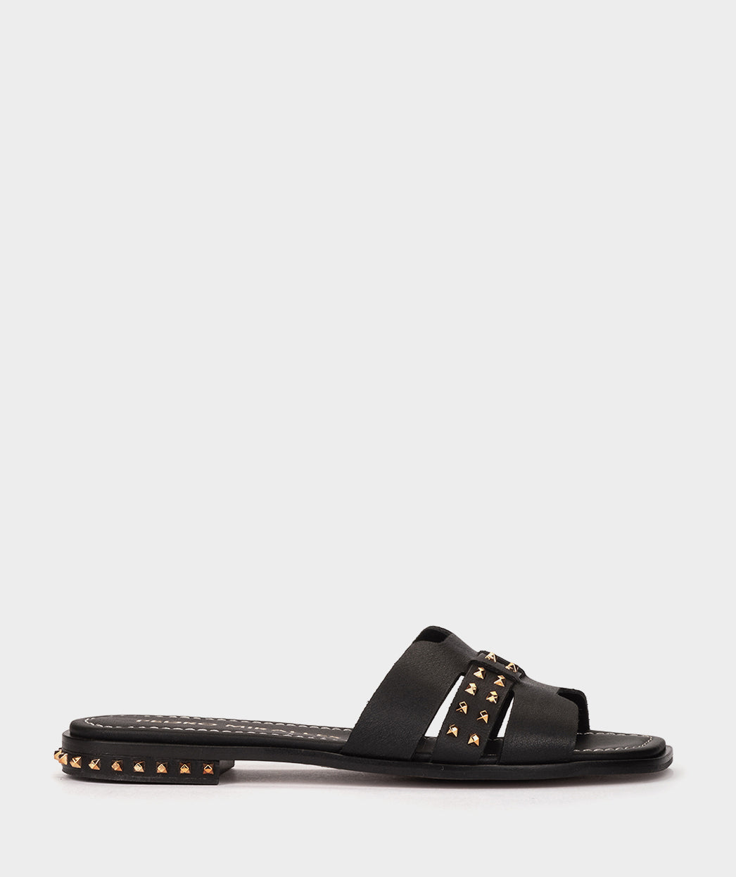 Flache schwarze Ledersandalen. Sie werden zum perfekten Schuhwerk für jeden Anlass. Sie sind auch ideal, um jedes Sommeroutfit aufzupeppen.