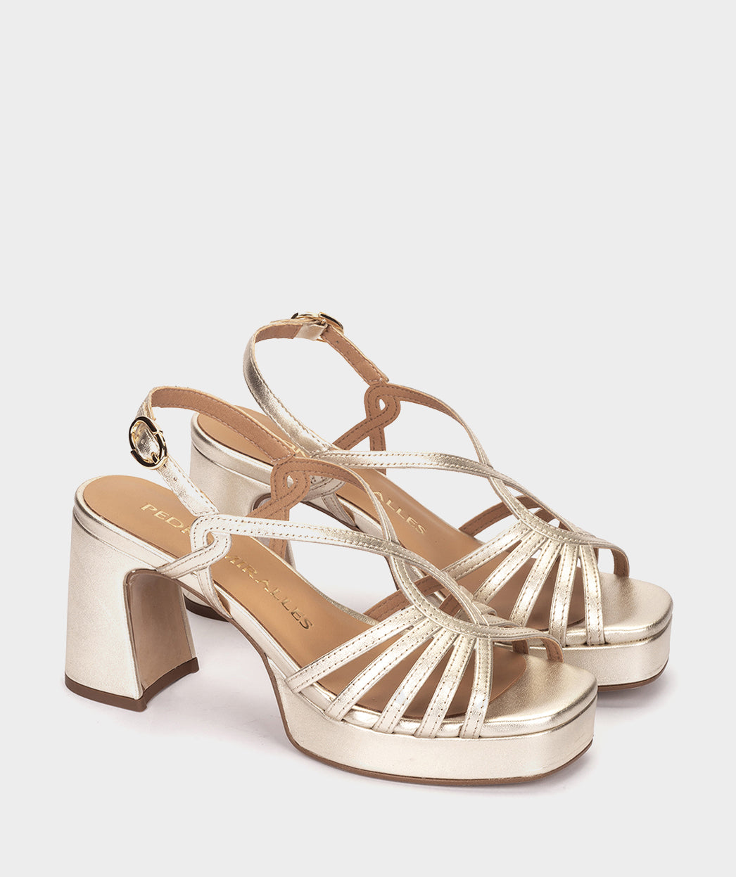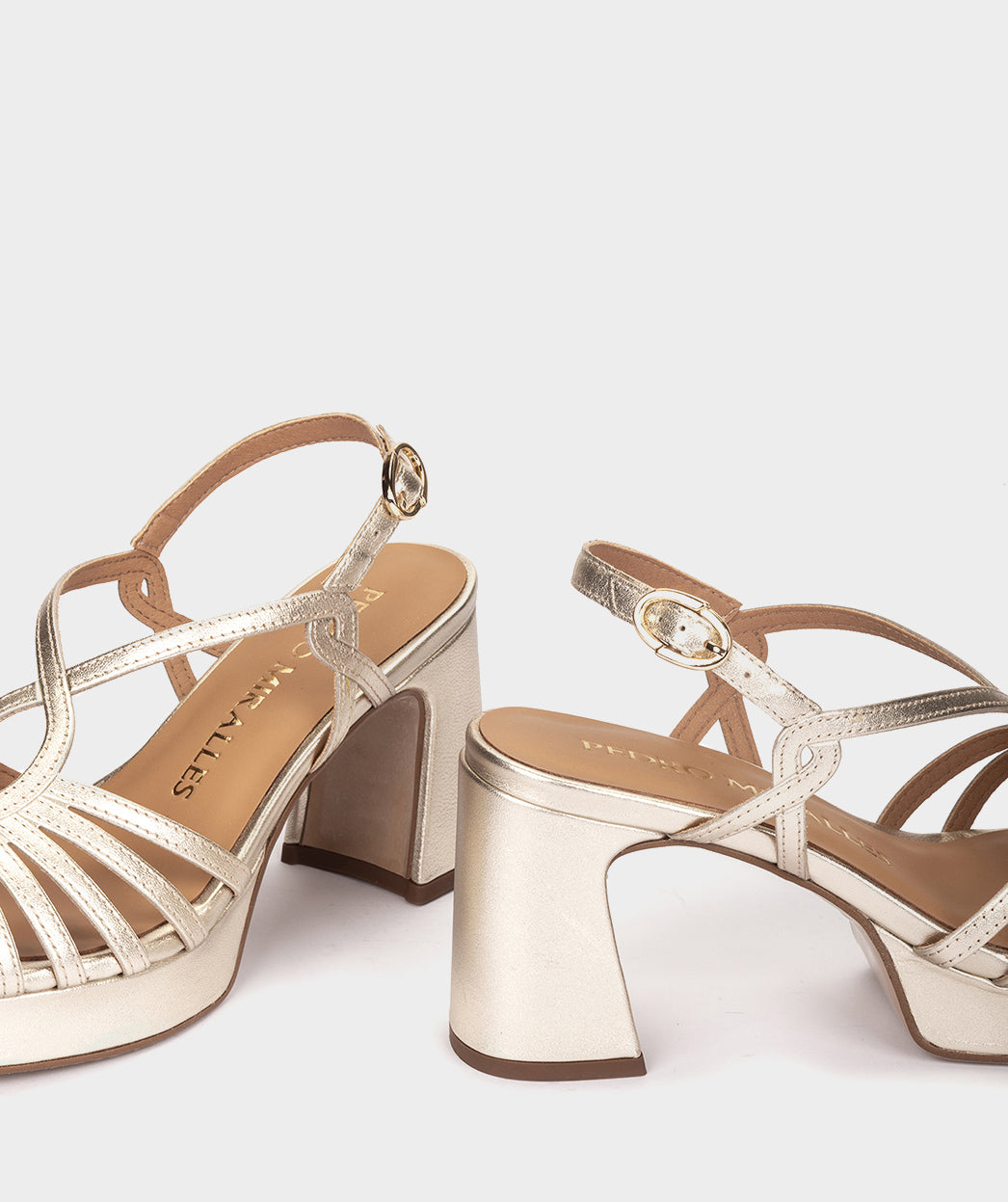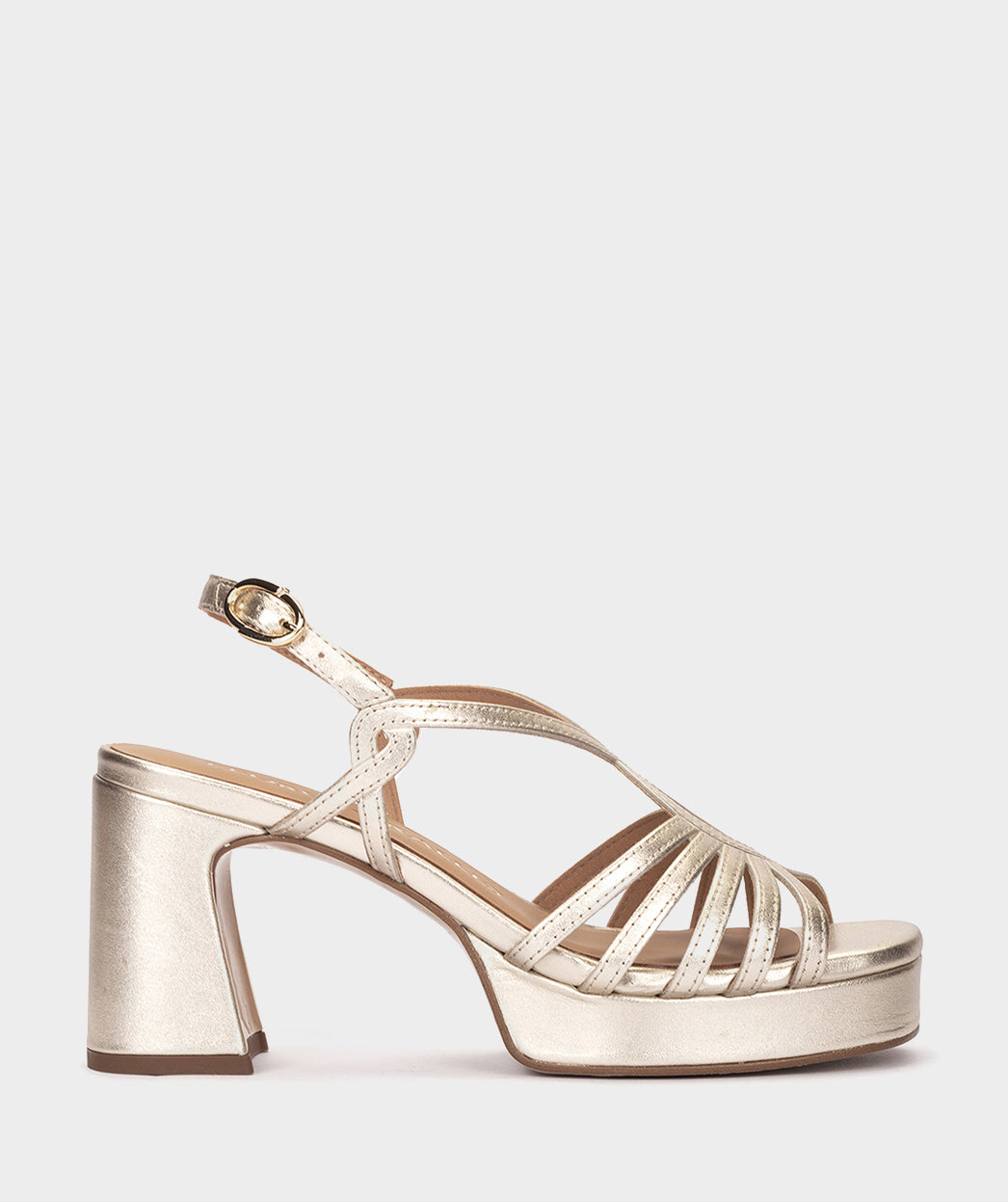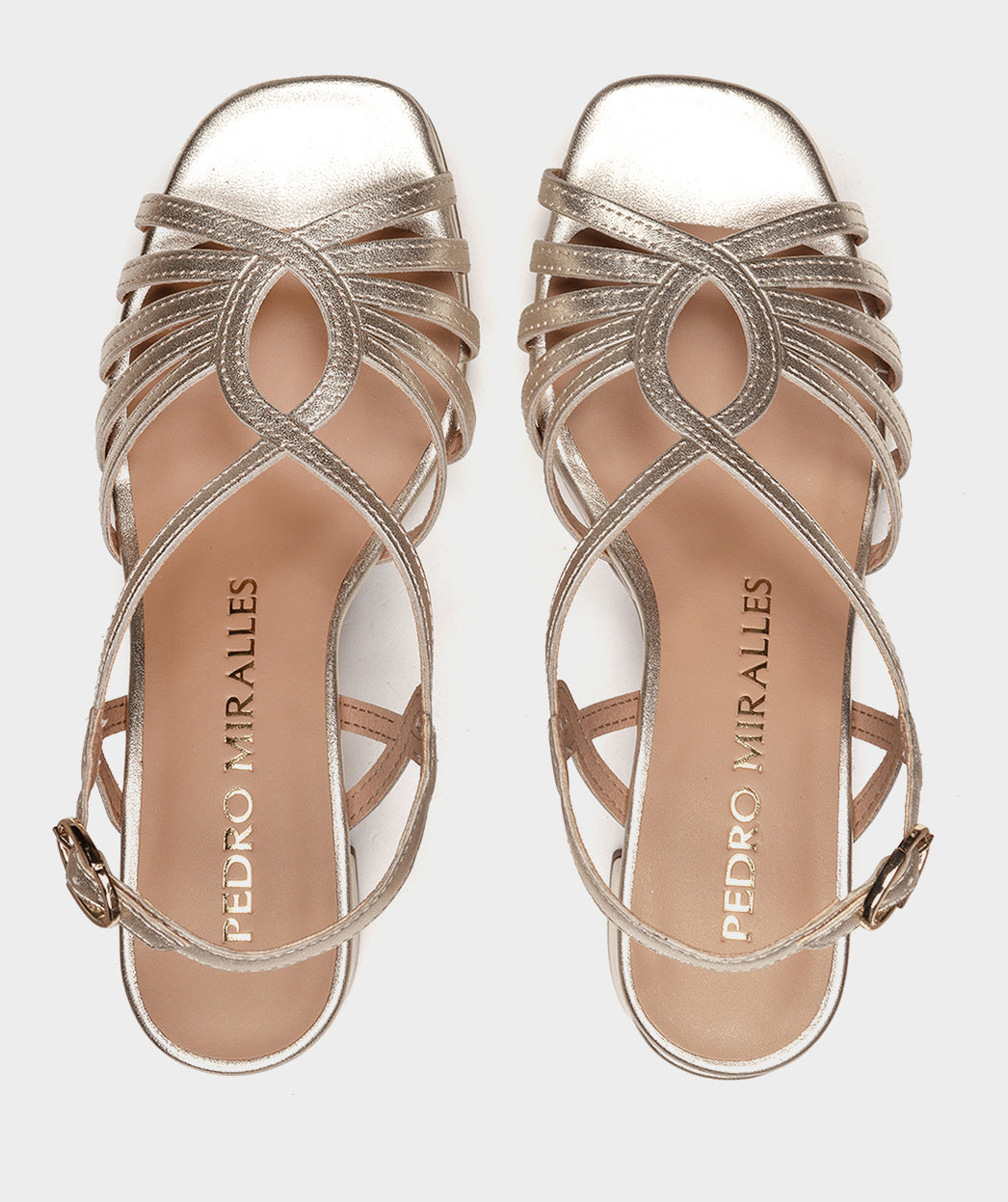 Platinfarbene Sandaletten mit Absatz aus Metallic-Leder. Ein ganz besonderes Design dank der Details der gekreuzten Riemen und der ovalen Form auf dem Spann. Das Modell PUZOL ist die perfekte Wahl für jeden Anlass.