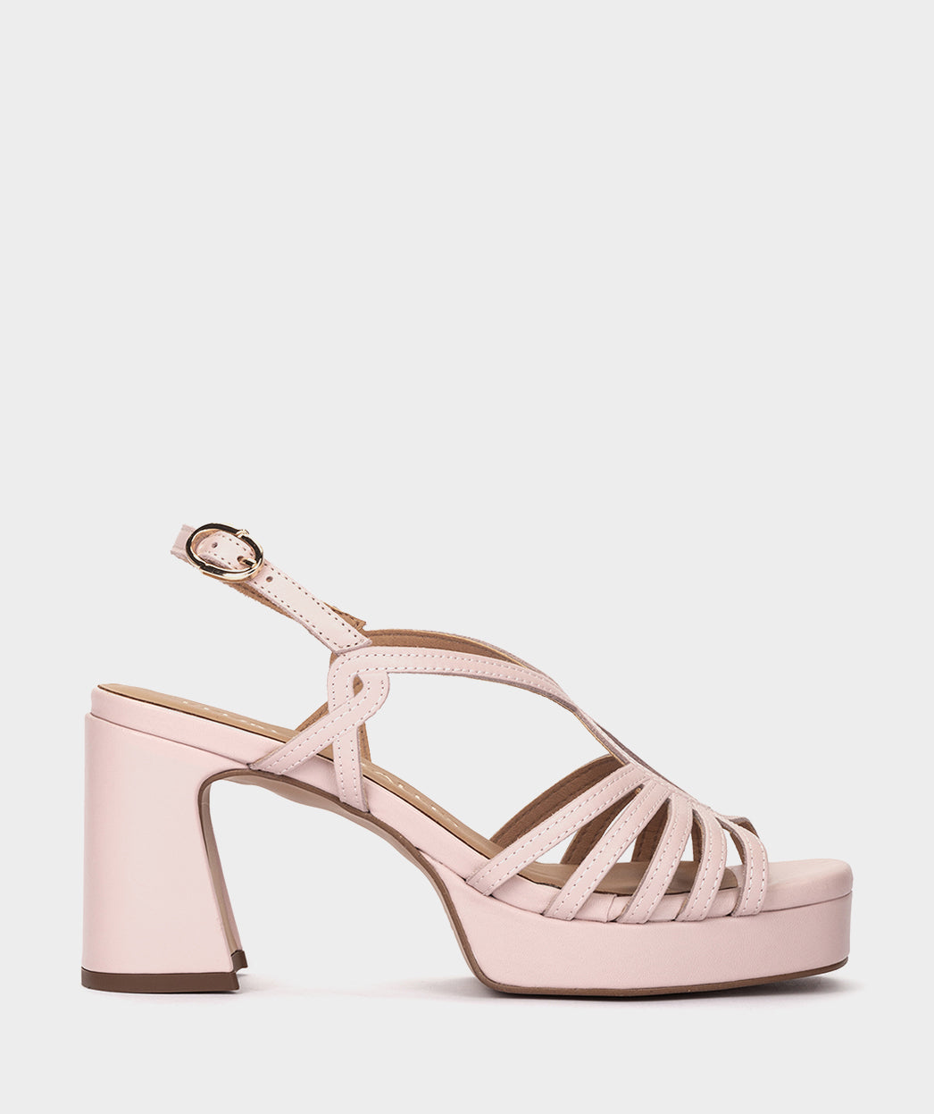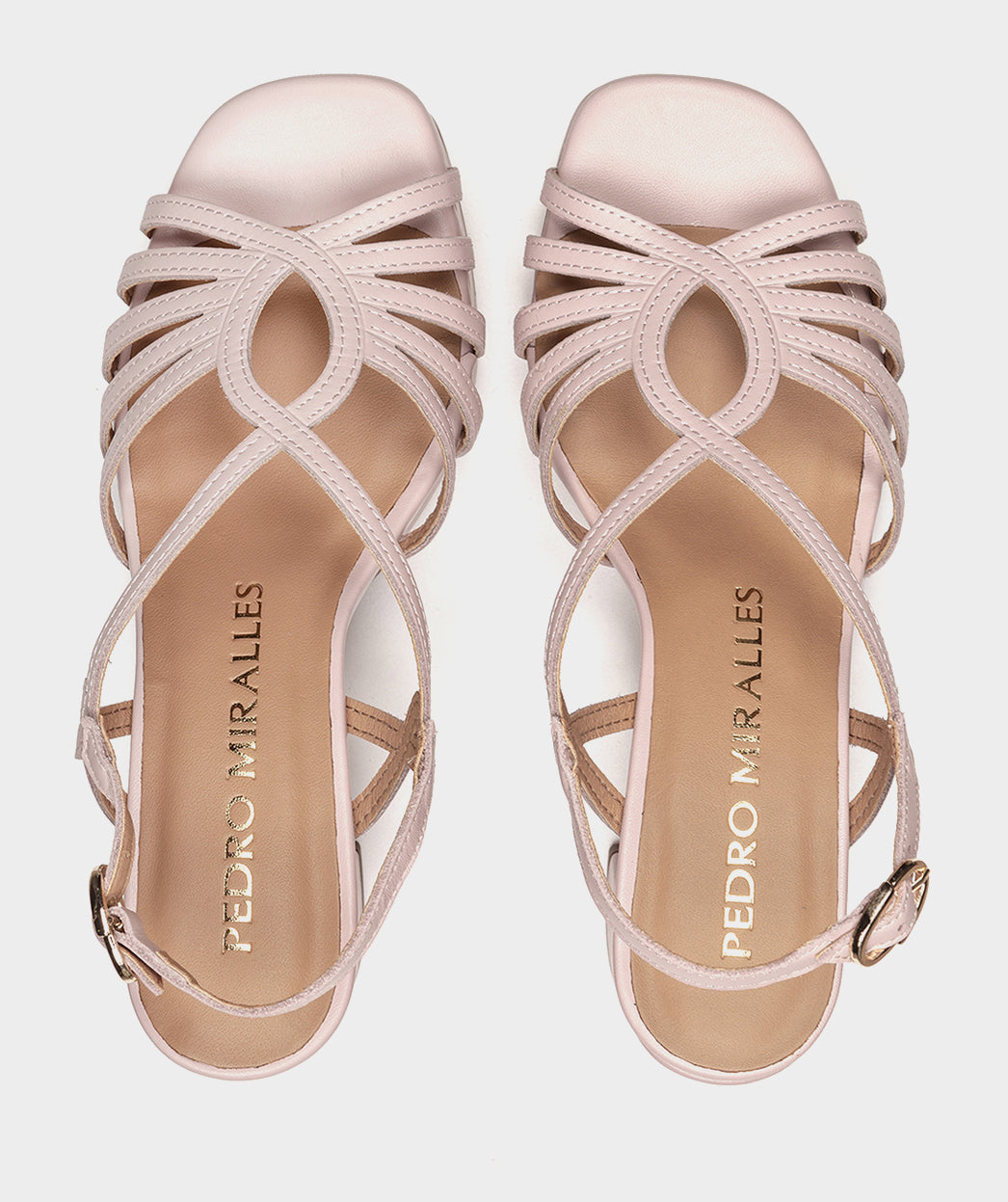 Sandalen mit Absatz aus metallischem, quarzfarbenem Leder. Ein ganz besonderes Design dank der Details der gekreuzten Riemen und der ovalen Form auf dem Spann. Das Modell PUZOL ist die perfekte Wahl für jeden Anlass.