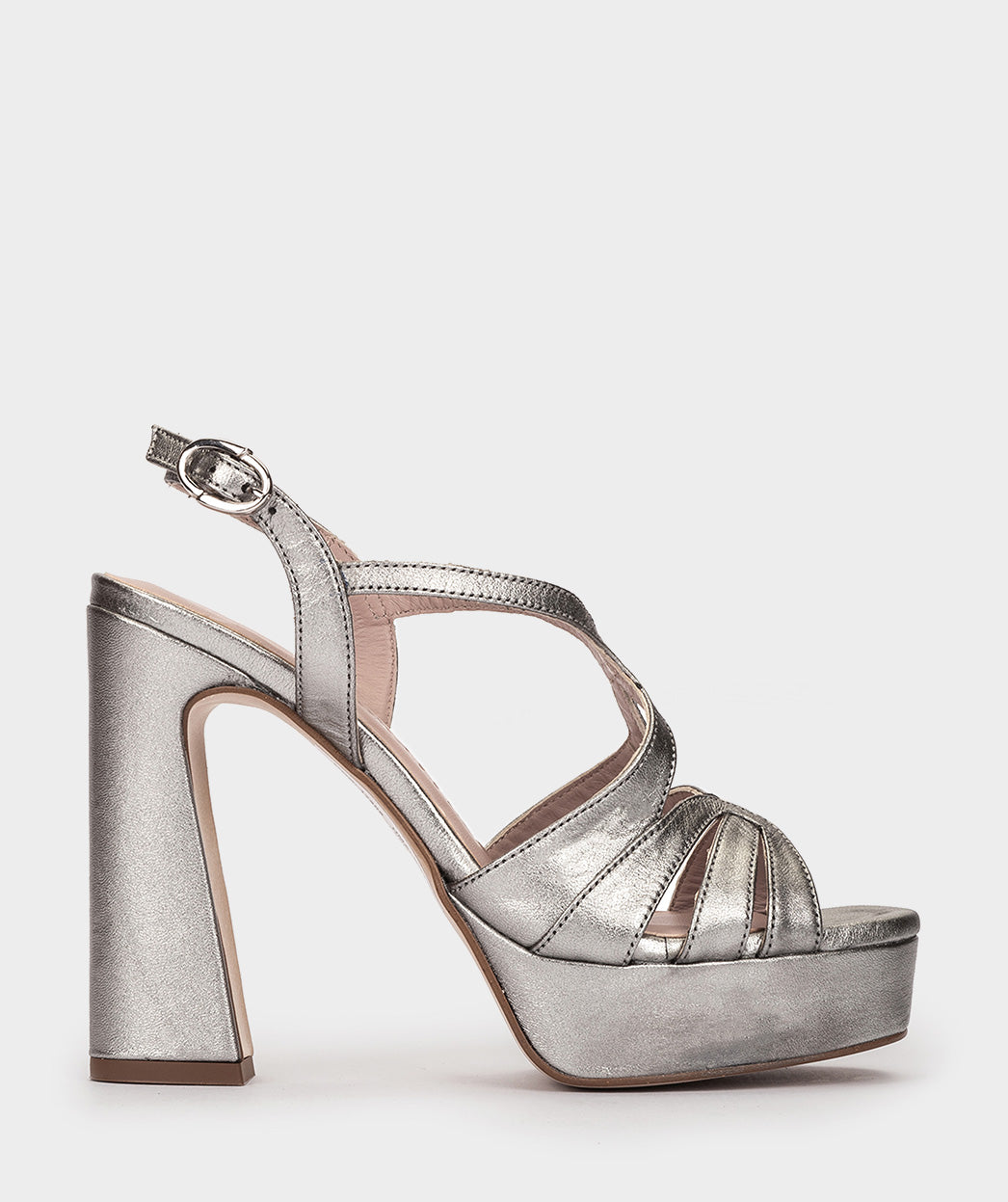 Sandalen mit Absatz aus metallisch bronzegrauem Leder. Die geschwungenen Riemchen über dem Spann kreieren einen eleganten und einzigartigen Ausschnitt. Dank des besonderen Designs ist dieser Stil besonders vorteilhaft.