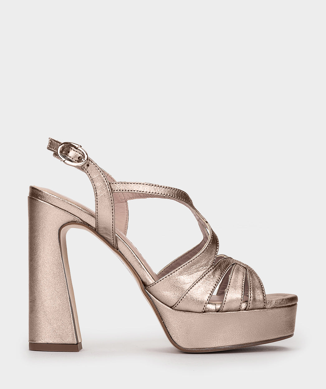 Sandalen mit Absatz aus metallischem, stahlfarbenem Leder. Die geschwungenen Riemchen über dem Spann kreieren einen eleganten und einzigartigen Ausschnitt. Dank des besonderen Designs ist dieser Stil besonders vorteilhaft.