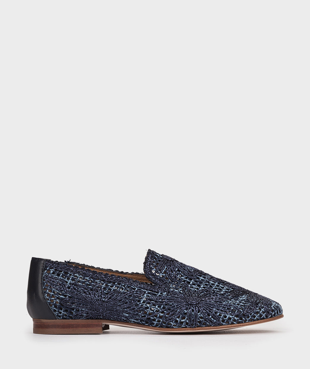 Marineblaue Bast-Loafer. Die sommerliche Ästhetik des Basts steht im Kontrast zur klassischen Silhouette des Mokassins. Ein originelles Modell, das sich perfekt zum Tragen mit Sommeroutfits eignet.