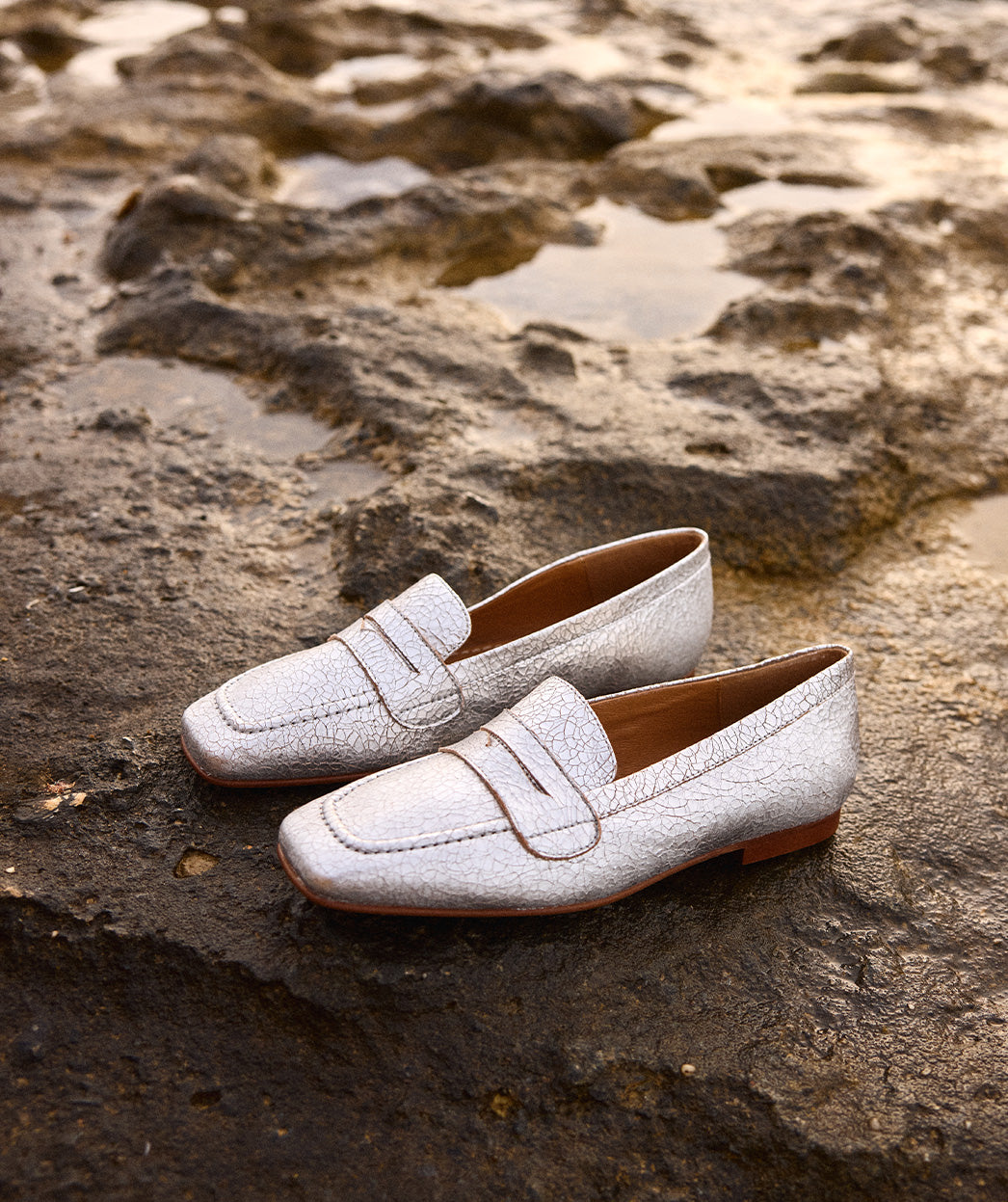 Silberfarbene Loafer aus Metallic-Leder. Ein Design, das sich sowohl für den Alltag als auch für Veranstaltungen eignet. Raffinesse wird zum Hauptmerkmal dieser Loafer, die in dieser Saison ein Hit zu werden versprechen.