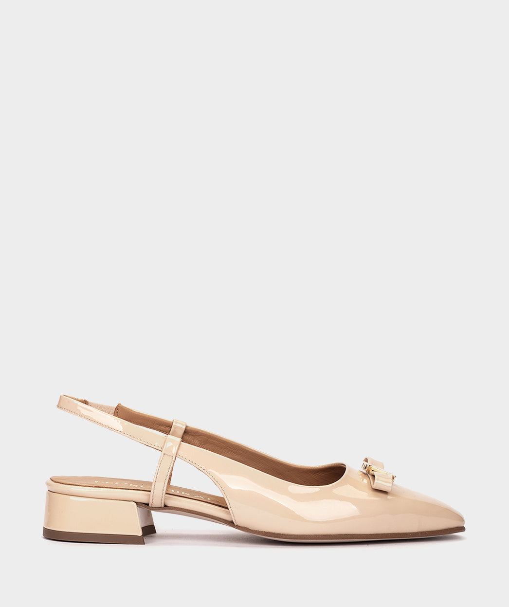 Beige Slingback-Pumps aus Lackleder. Ein klassisches und zeitloses Modell, mit dem Sie Alltagslooks kreieren oder es für die besonderen Anlässe kombinieren können.