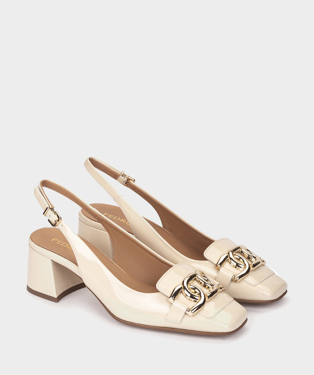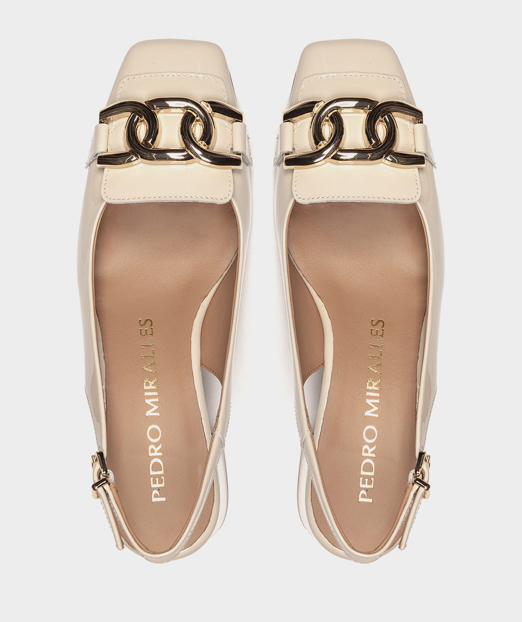 Slingback-Pumps aus weißem Lackleder. LIGURIA ist die perfekte Option, um sie im Alltag zu kombinieren, ohne dabei die Raffinesse aus den Augen zu verlieren. Verleihen Sie Ihrem Look Eleganz und entscheiden Sie sich mit diesem Modell für Komfort.