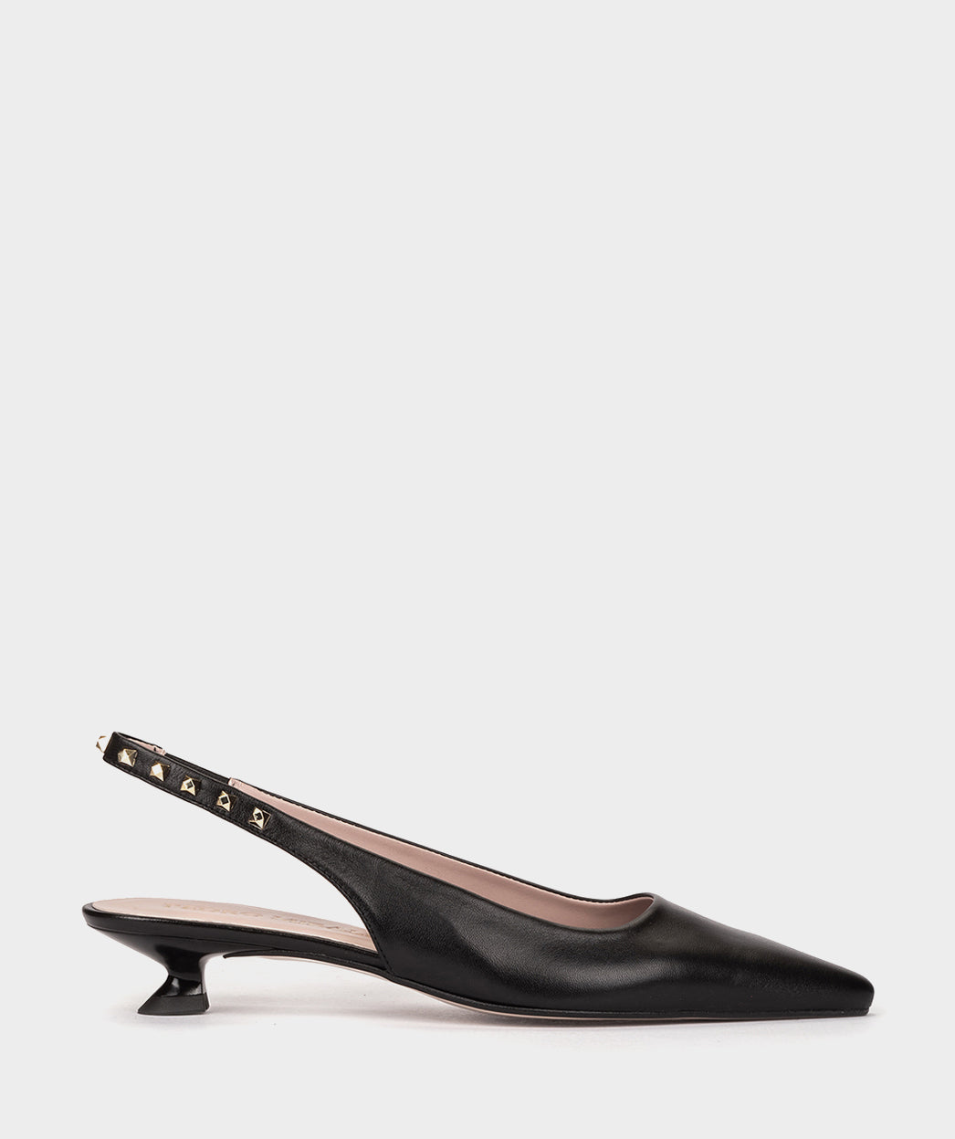 Schwarze Slingback-Schuhe aus Leder mit niedrigem Absatz. Die modische Höhe passt sich auch den klassischsten Silhouetten an. Ein Modell, das sich jedem Anlass anpasst. Das Detail der rückseitigen Nieten am Gummiband macht den Unterschied.