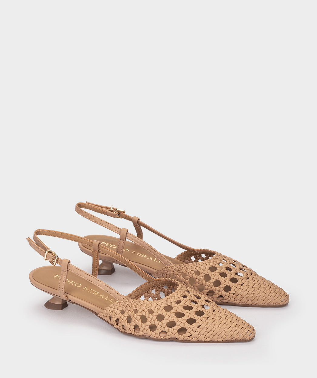 Braune, geflochtene Schuhe mit spitzer Spitze und freier Fersenpartie. SANTO DOMINGO Schuhe bieten eine perfekte Kombination aus Komfort und Mode. Kombinieren Sie sie mit Ihren Lieblingsstücken der Saison.