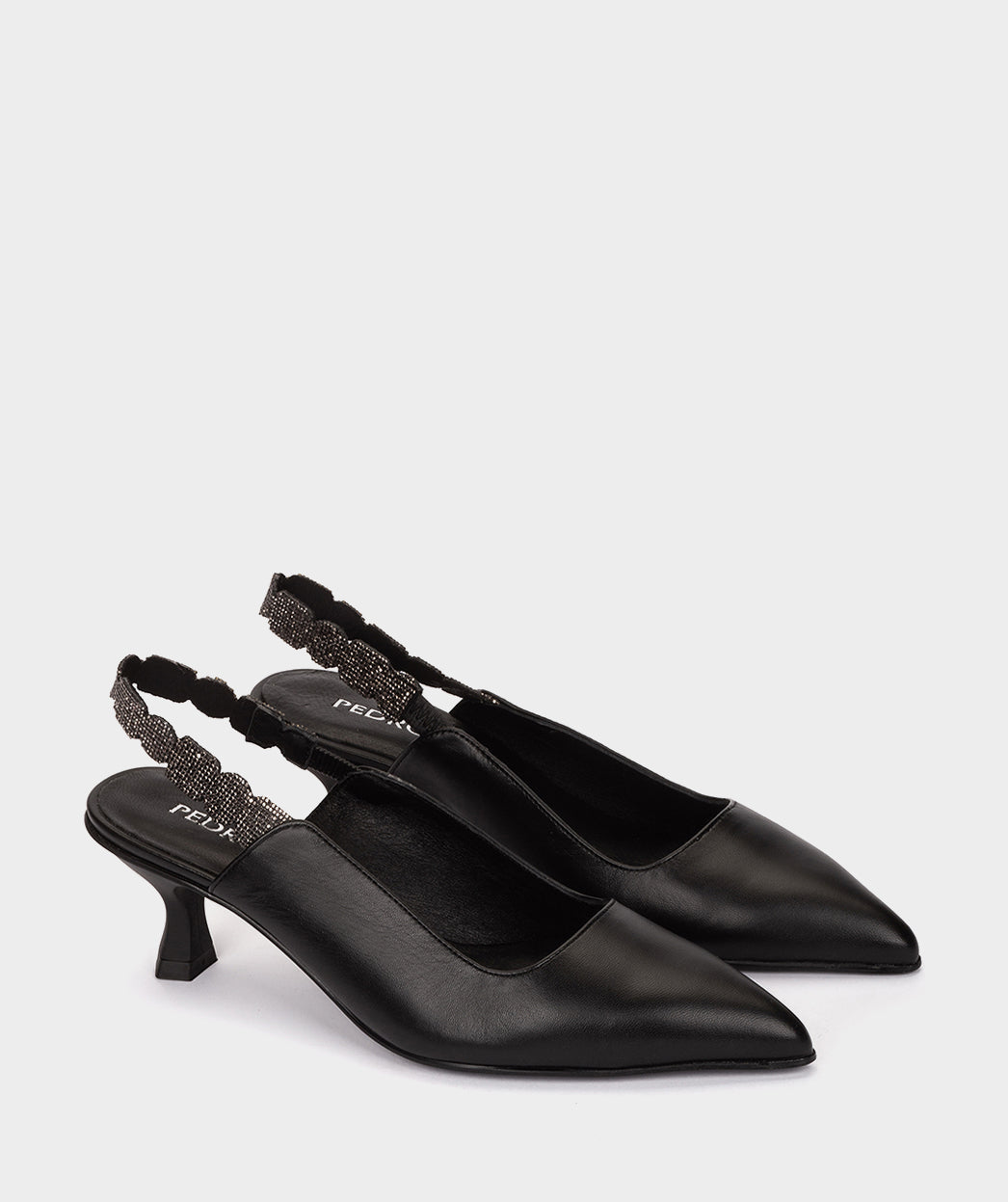 Schwarze Slingback-Absätze aus Leder. Komfort und Stil vereinen sich im ESLIDA-Modell. Wenn Sie auf der Suche nach einem eleganten Schuh sind, aber Komfort an erster Stelle steht, ist diese Option ideal für Sie.