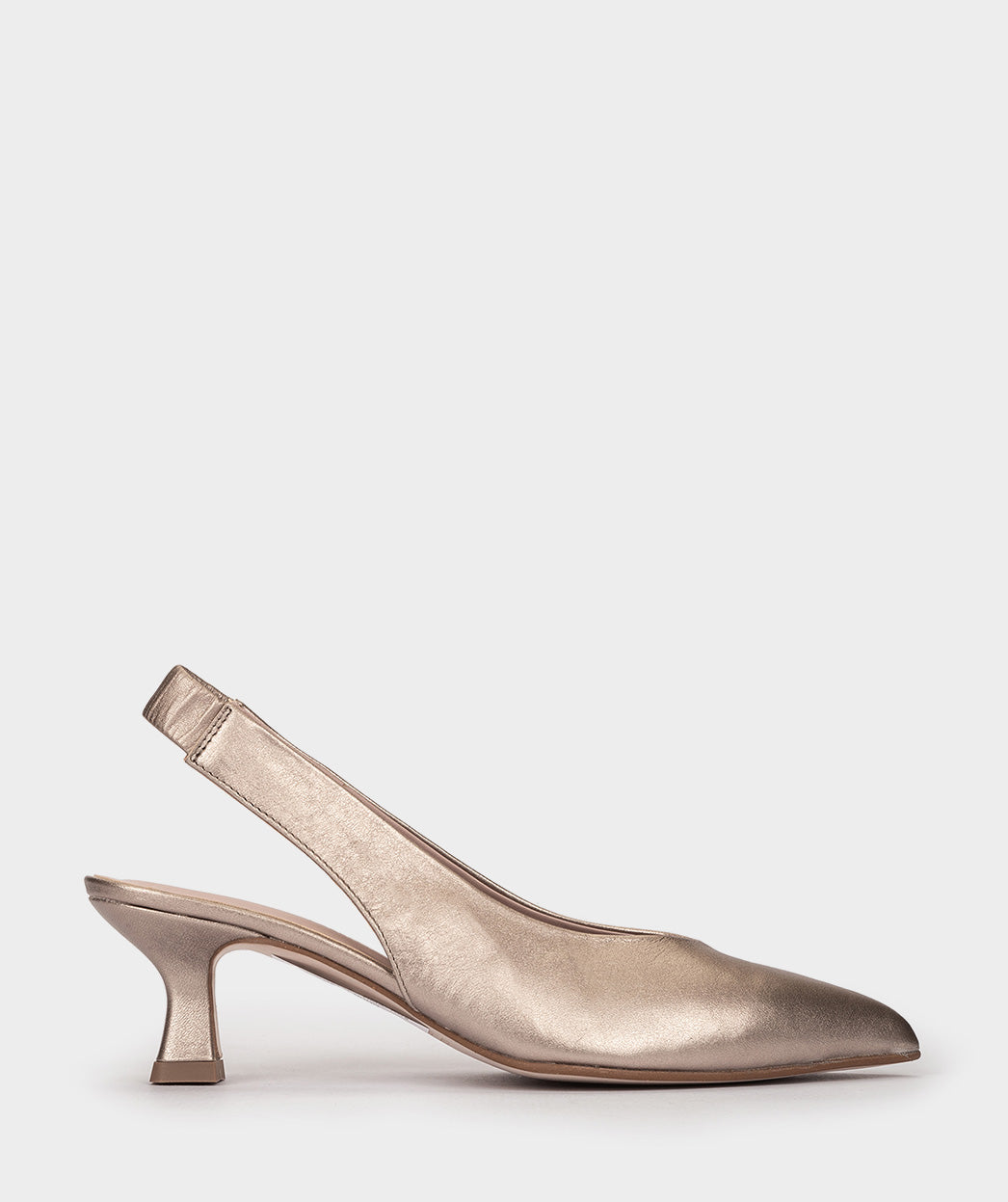 Slingback-Absätze aus rauchfarbenem Metallic-Leder. Seine stilisierende Silhouette und der bequeme Absatz machen ihn zum perfekten Begleiter sowohl im Alltag als auch bei Veranstaltungen. Es verfügt über eine elastische Rückseite, die eine optimale Passform ermöglicht.