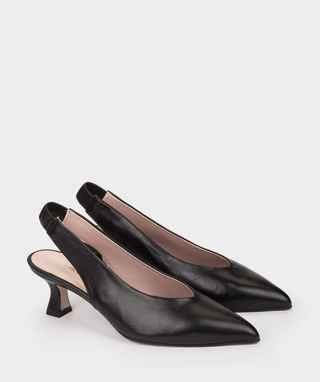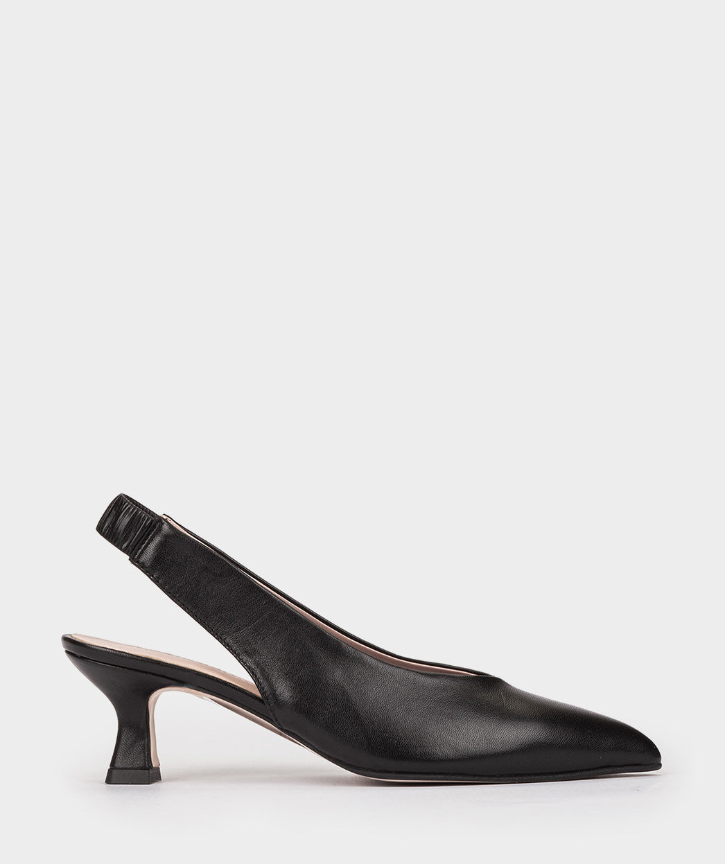Slingback-Absätze aus schwarzem Leder. Seine stilisierende Silhouette und der bequeme Absatz machen ihn zum perfekten Begleiter sowohl im Alltag als auch bei Veranstaltungen. Es verfügt über eine elastische Rückseite, die eine optimale Passform ermöglicht.