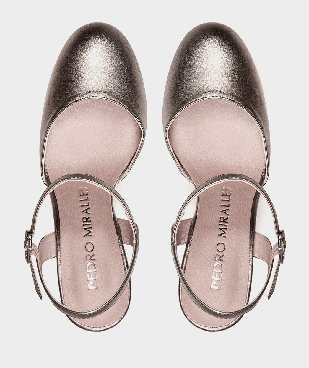 Absatzschuhe mit Plateau aus anthrazitfarbenem Metallic-Leder. Diese Pumps sind sehr komplett, sie haben eine geschlossene Spitze, einen Riemen, der Ihren Fuß festhält, und ein Plateau, das die Absatzhöhe sehr bequem macht. Deshalb sind sie unsere Lieblingsschuhe mit Absatz für die formellsten Anlässe._x000D_