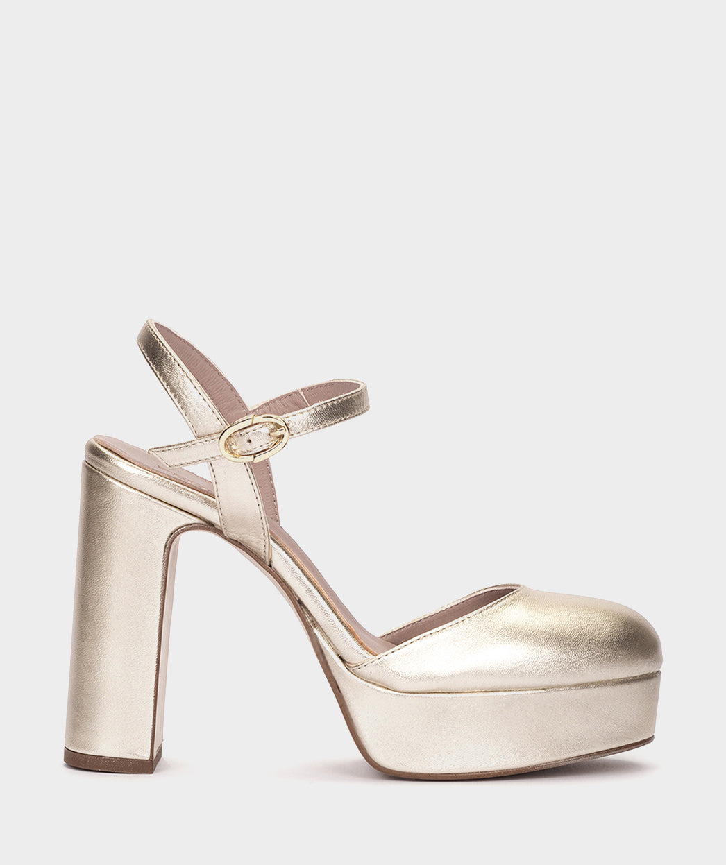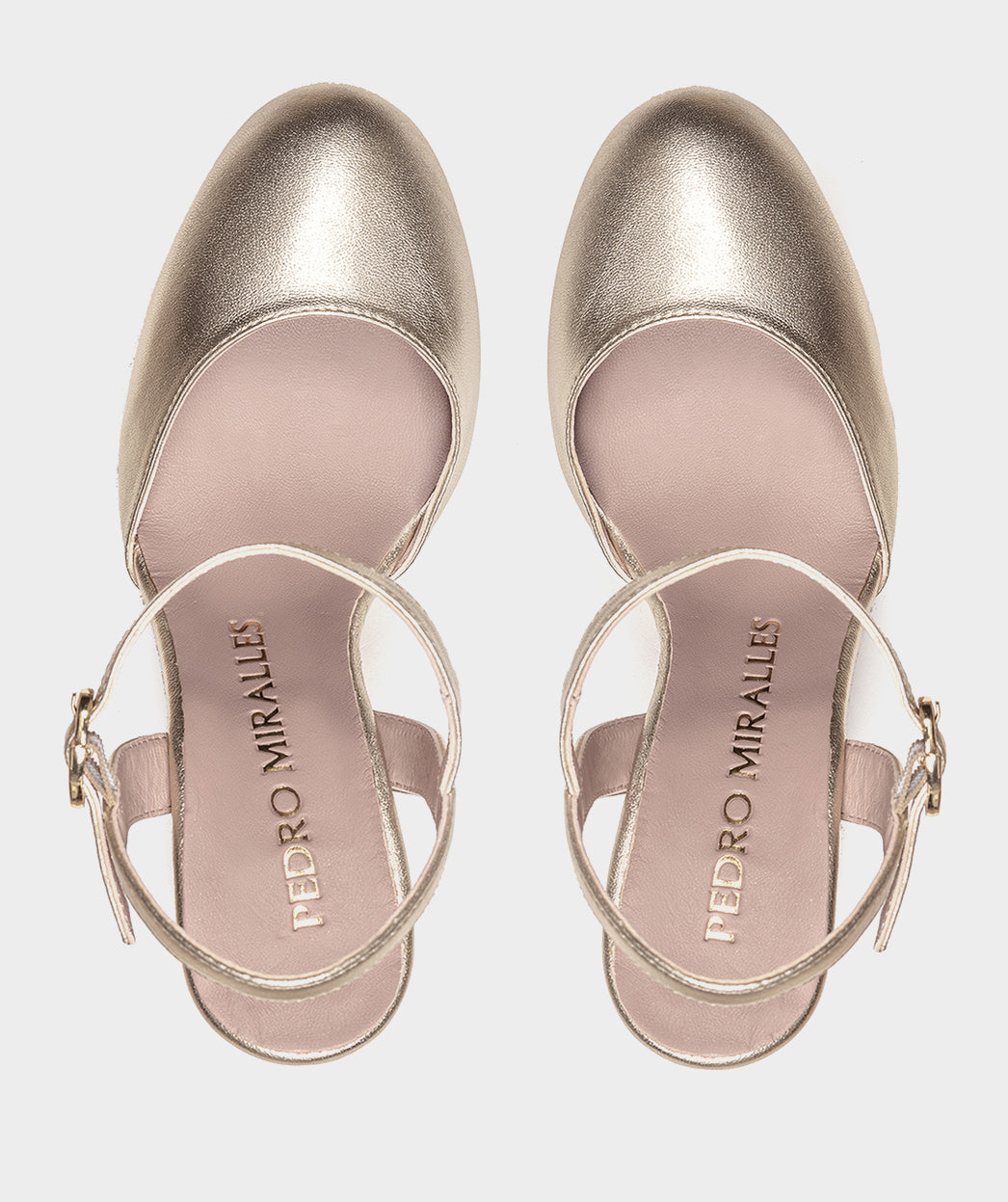 Plateauschuhe aus platinfarbenem Metallic-Leder. Diese Absätze sind sehr komplett, sie haben eine geschlossene Spitze, einen Riemen, der Ihren Fuß hält, und eine Plateausohle, die die Höhe des Absatzes sehr erträglich macht. Deshalb sind sie sind unsere Lieblings-Heels für die formellsten Anlässe._x000D_