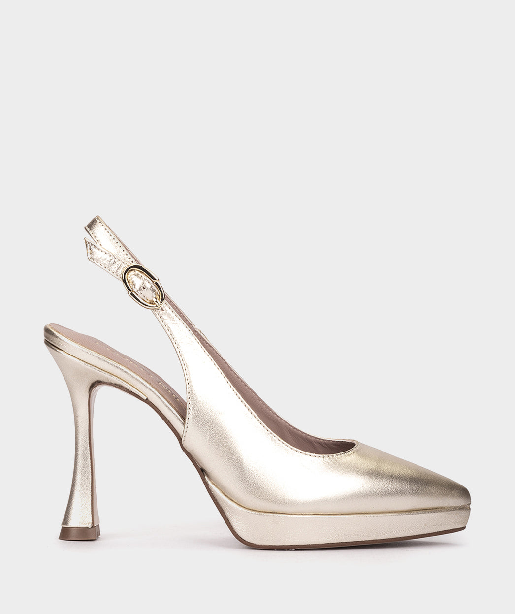 Platinfarbene High Heels aus Metallic-Leder. Das Modell Rena ist eine neue Version unserer kultigen Pumps, die Ihnen eine elegante Höhe verleihen, ohne auf Komfort verzichten zu müssen.