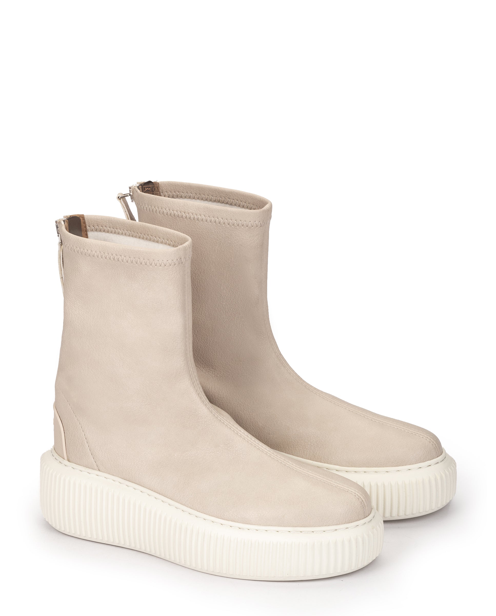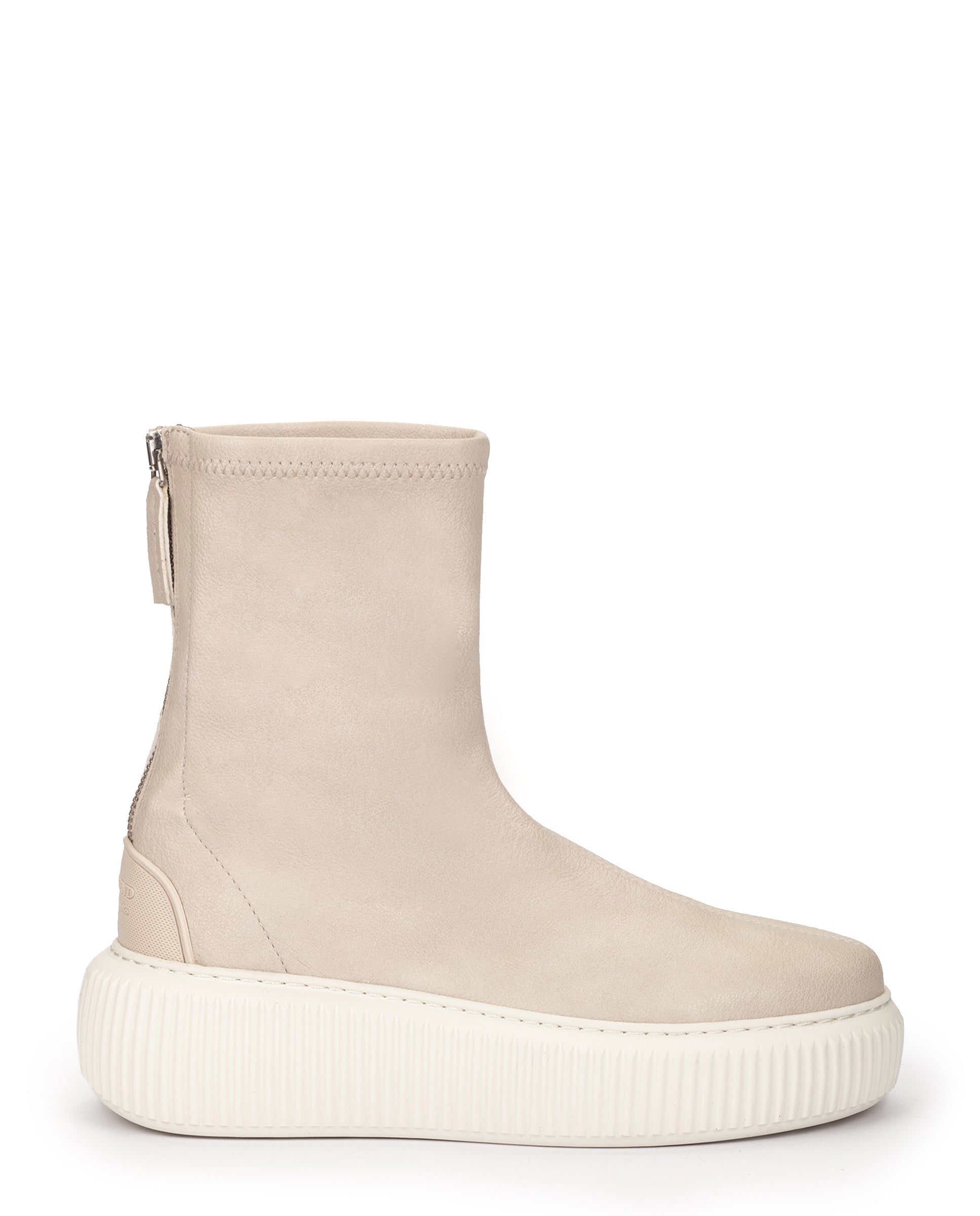 Weiße Stiefeletten aus elastischem Stoff. Ein Modell, das sich durch seinen Komfort und sein sportliches Design auszeichnet. Es hat einen Reißverschluss auf der Rückseite, um es bequem anzuziehen.