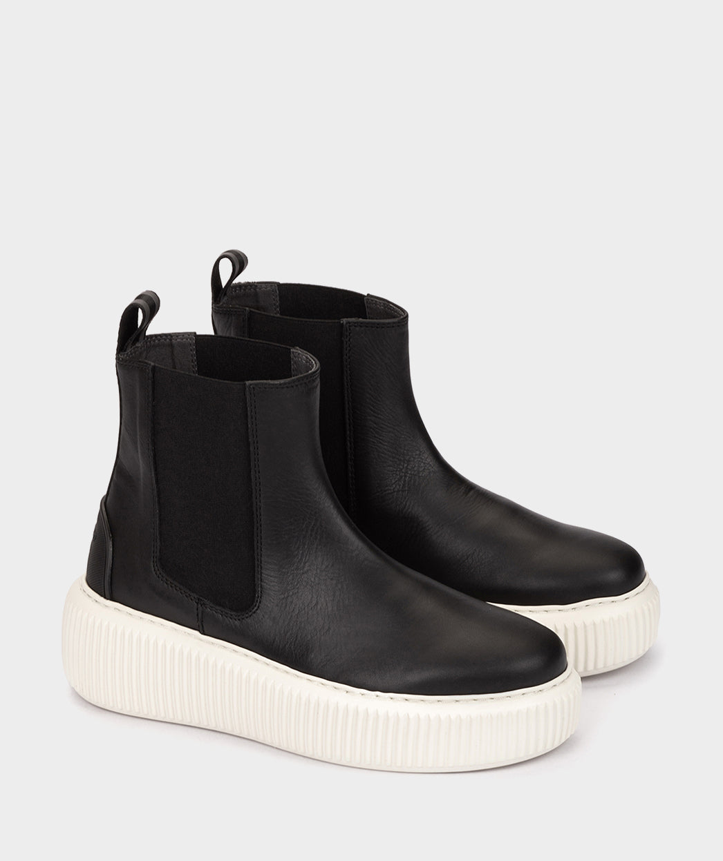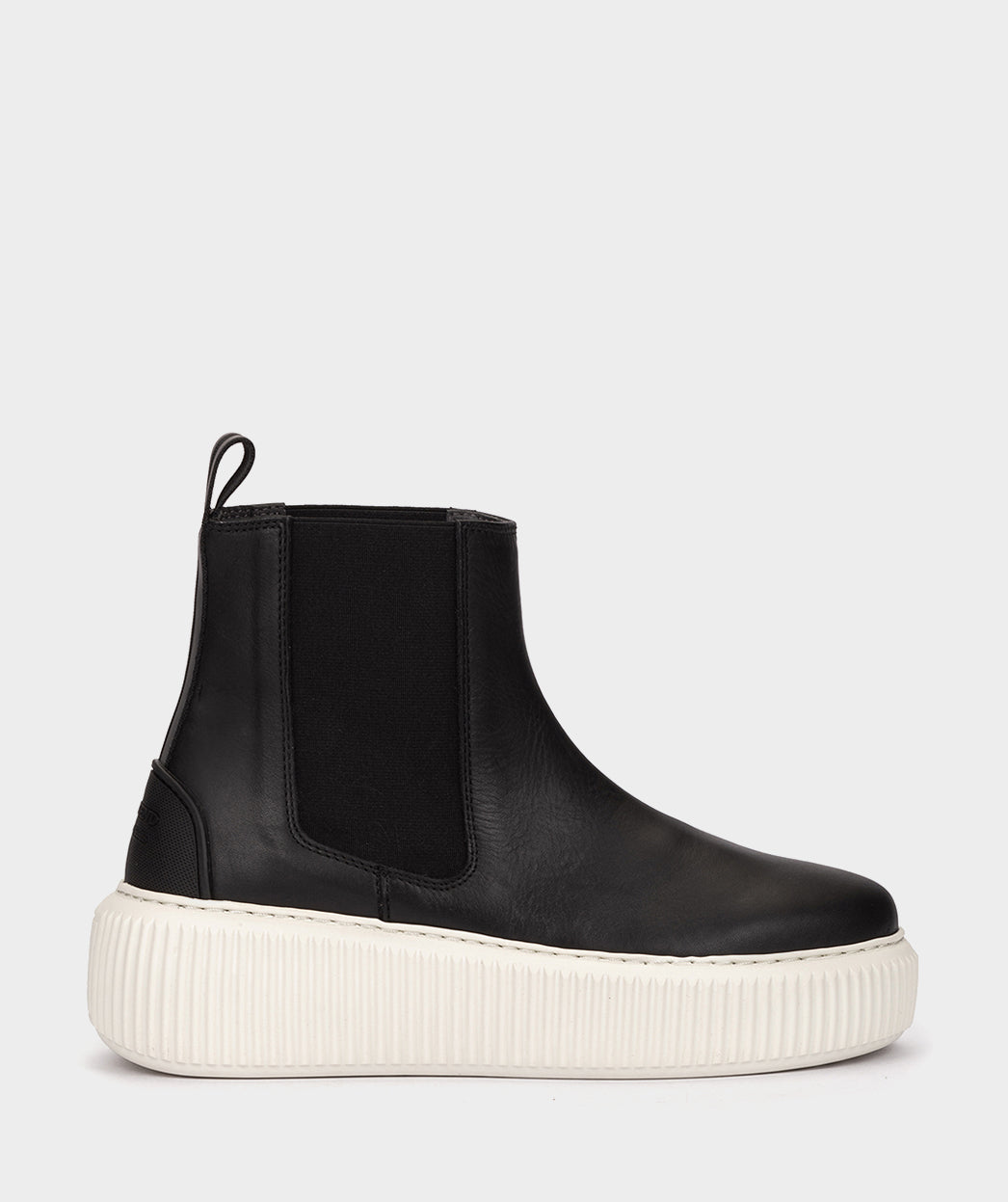 Schwarzer Sportstiefel aus Leder. Plateaustiefel, der aufgrund seiner Vielseitigkeit und seines Komforts zu einem festen Bestandteil Ihrer Garderobe wird.