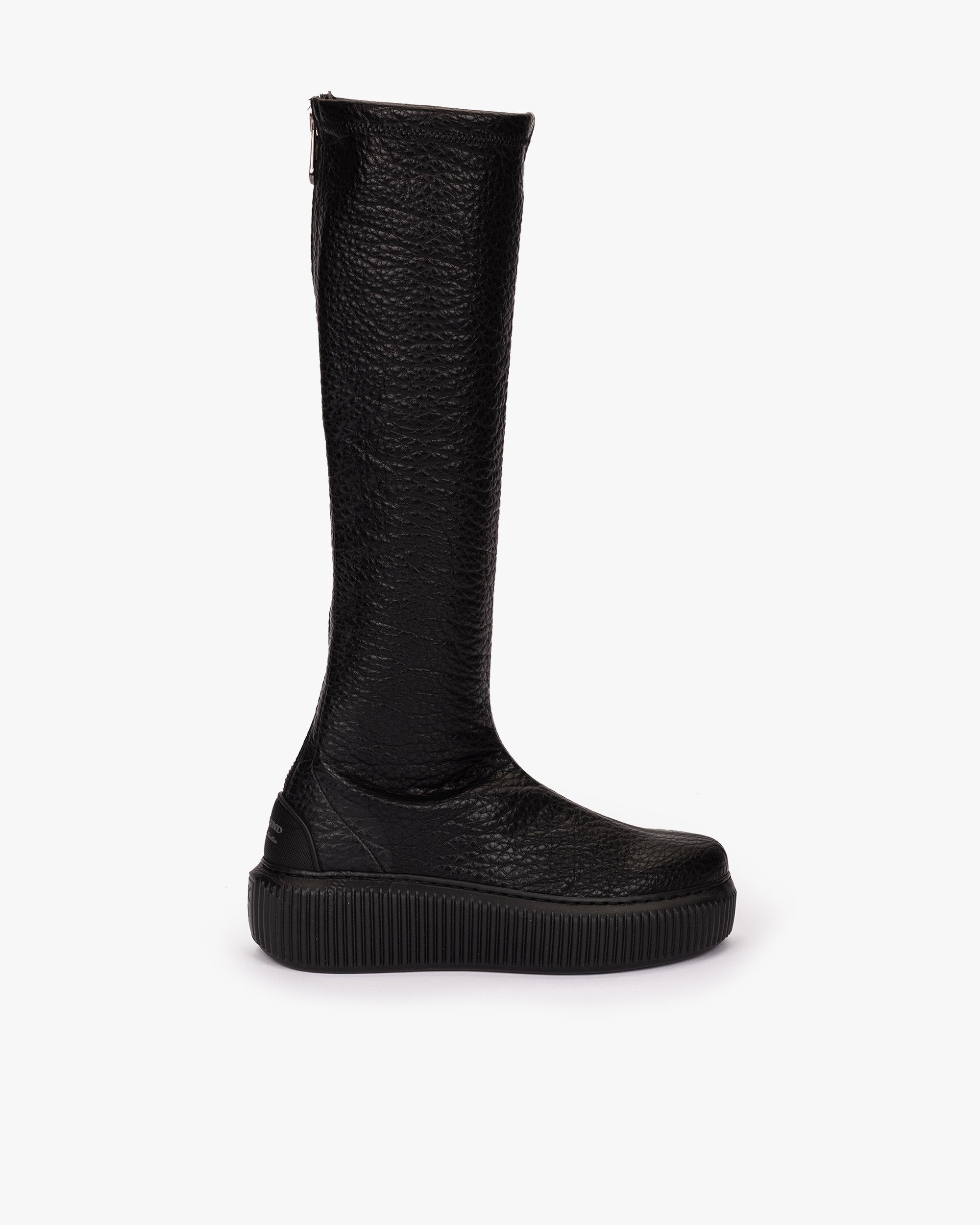 Schwarze elastische Stiefel aus Stoff mit Kunstledereffekt. Ein Design, das sich durch seinen elastischen Stoff auszeichnet, der sich an die Silhouette und das Bein anpassen kann. Es hat einen Reißverschluss auf der Rückseite für eine bequeme Passform.