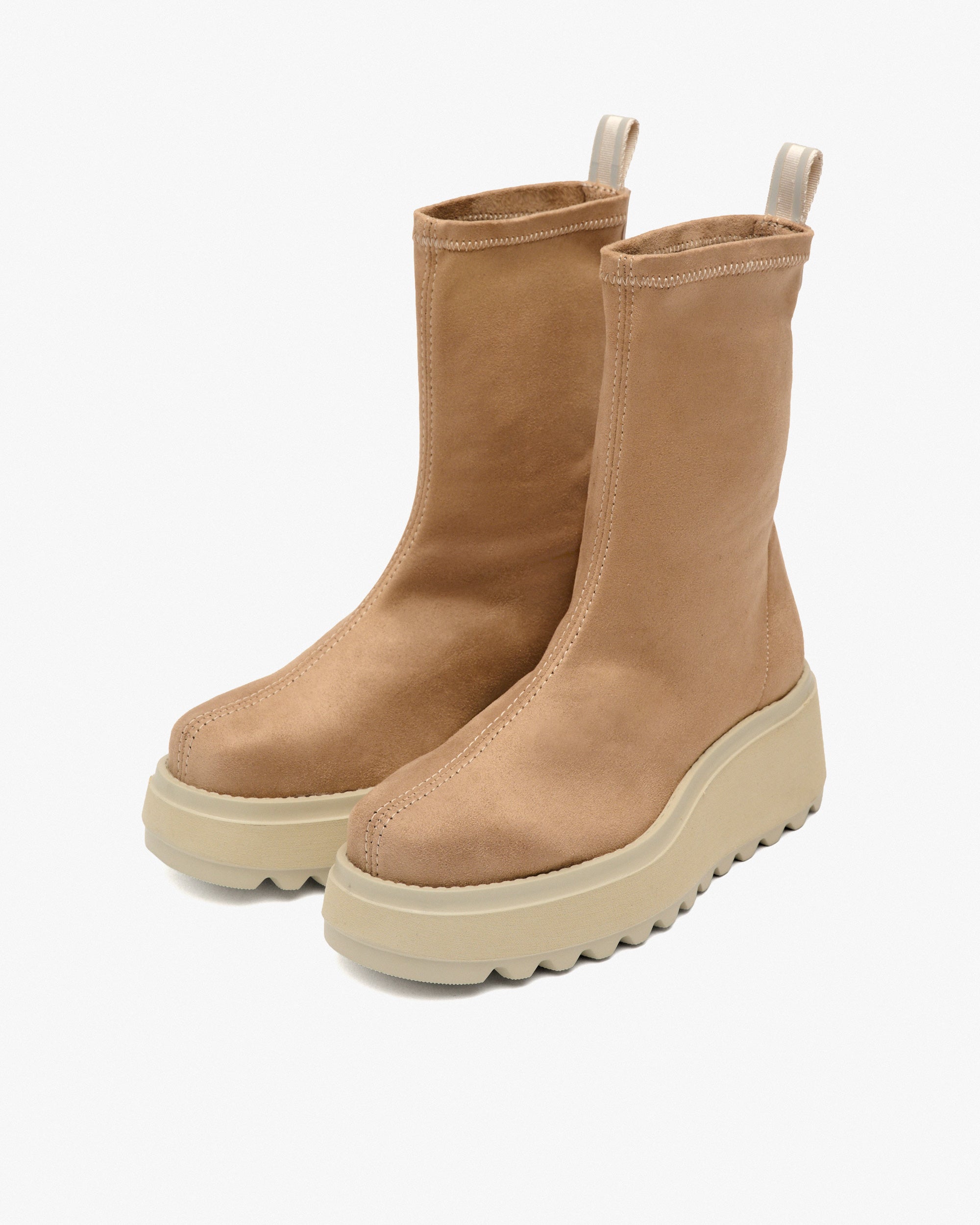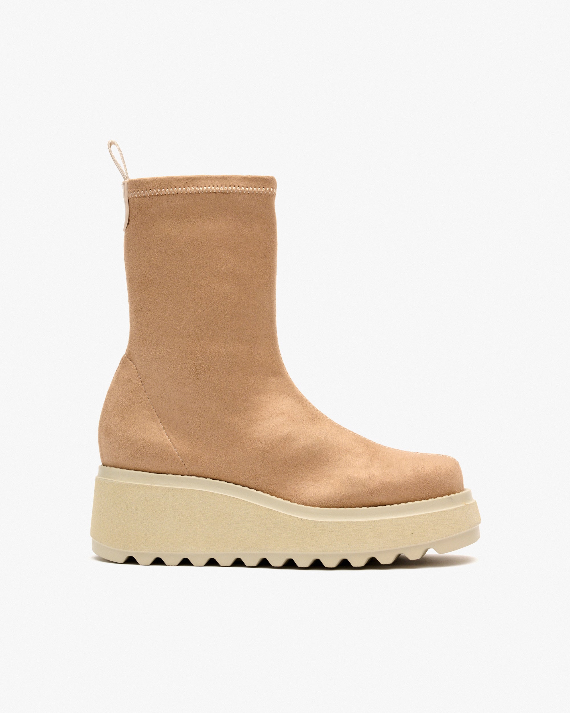 Beigefarbene Stiefeletten aus Stretchgewebe in Wildlederoptik. Perfektes Design, das zu lässigen Outfits getragen werden kann, kombiniert Komfort und Stil. Das Modell TIERRENO passt sich Ihnen an und bietet eine tadellose Passform, als wäre es eine Socke.