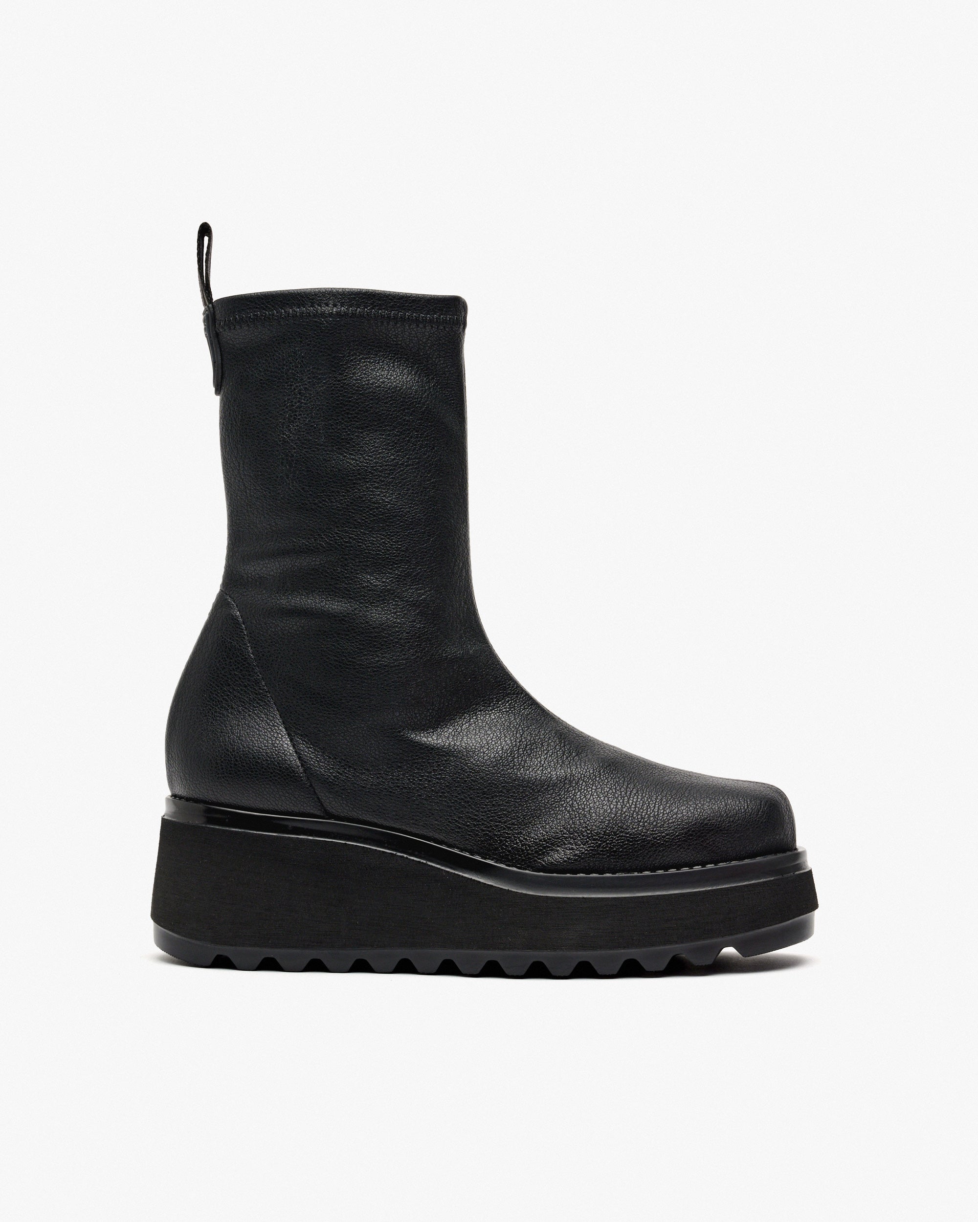 Schwarze elastische Stiefeletten aus Stoff mit Ledereffekt. Perfektes Design, das zu lässigen Outfits getragen werden kann, kombiniert Komfort und Stil. Das Modell TIERRENO passt sich Ihnen an und bietet eine tadellose Passform, als wäre es eine Socke.