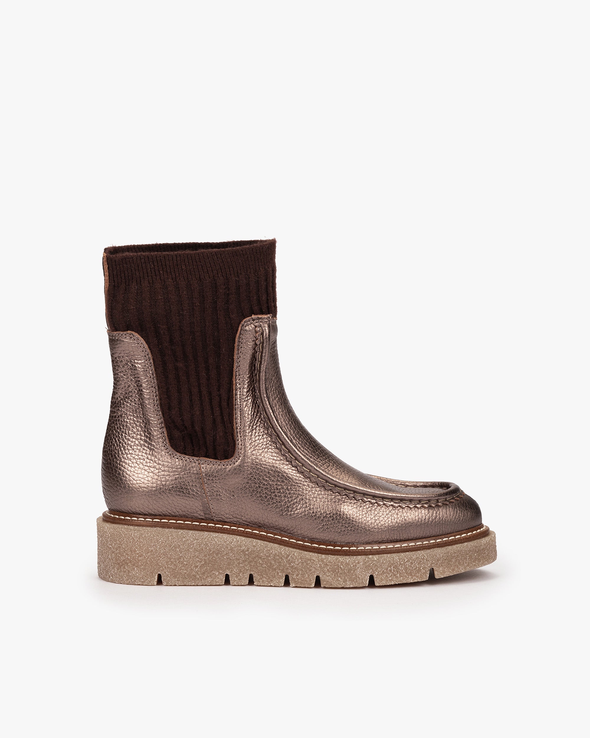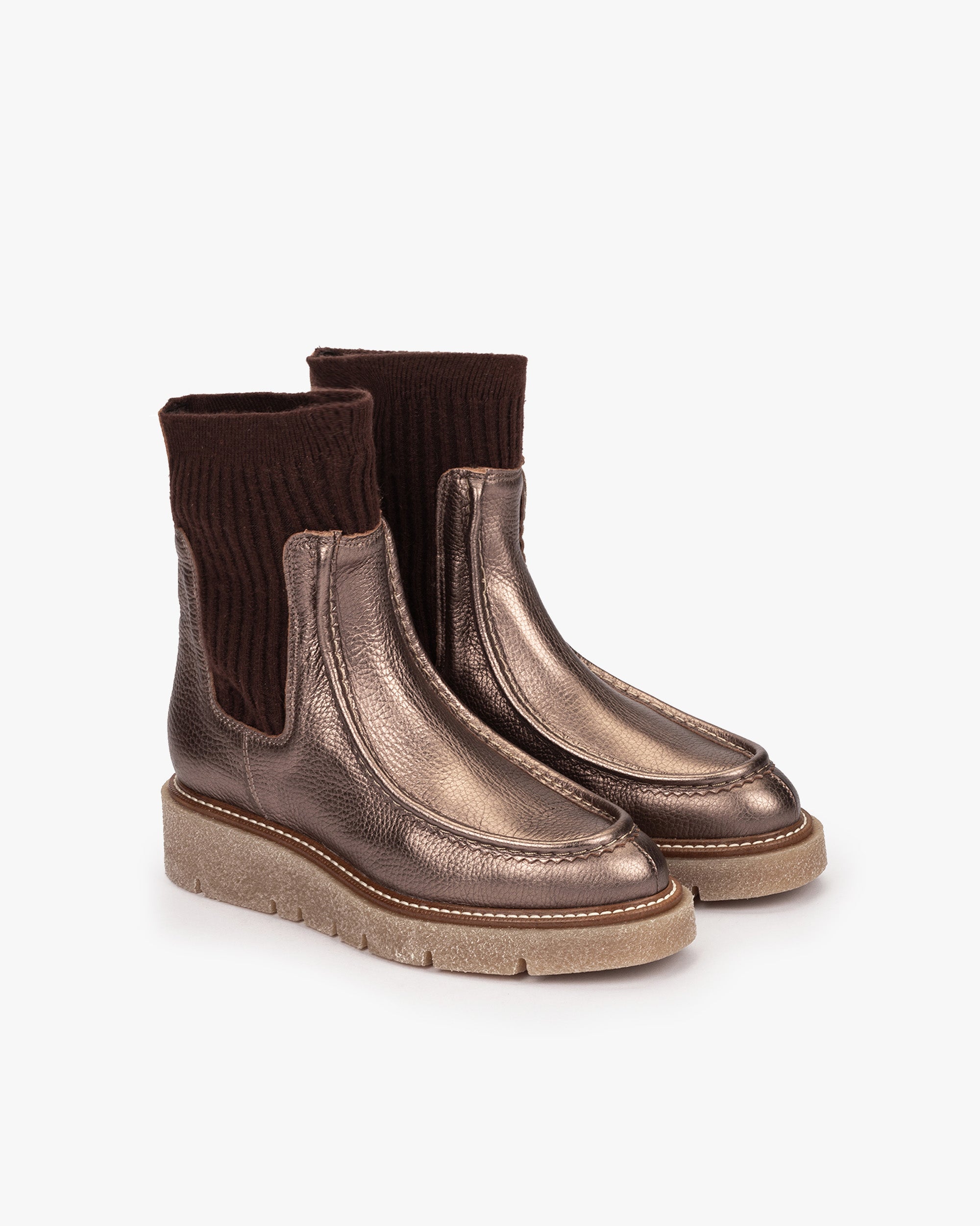 Des bottines métalliques en cuir de couleur bronze. Le design des bottines Patagonia s'adapta parfaitement au pied, l'épousant avec confort et sopfinement. Un modèle idéal pour les personnes froides, grâce à l'effet chaussette de la tige. Profitez-en tout l'Hiver, que ce soit au village, en ville, hänge die Loisirs oder die Travail an.