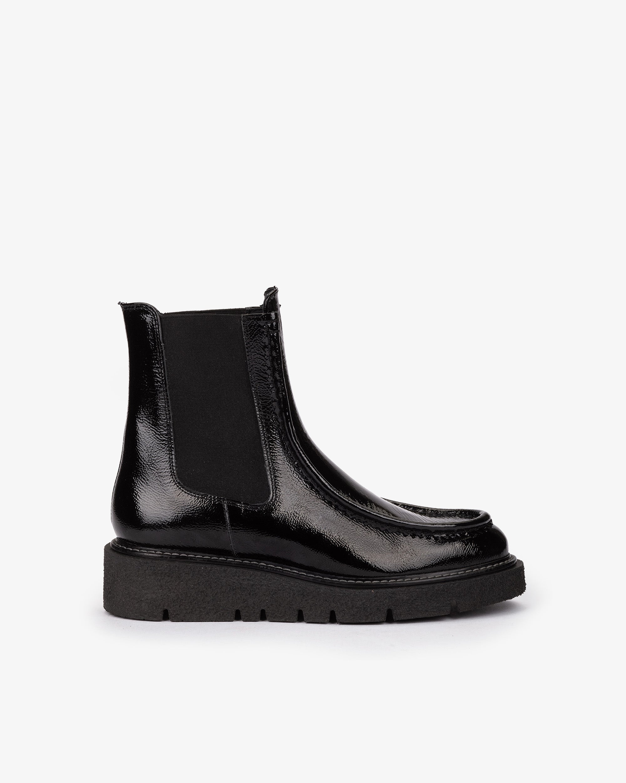 Schwarze Stiefeletten aus Lackleder. Die Crêpe-Sohle sorgt für einen sicheren Halt und außergewöhnlichen Gehkomfort. Der seitliche Gummizug ermöglicht ein bequemes Anziehen.