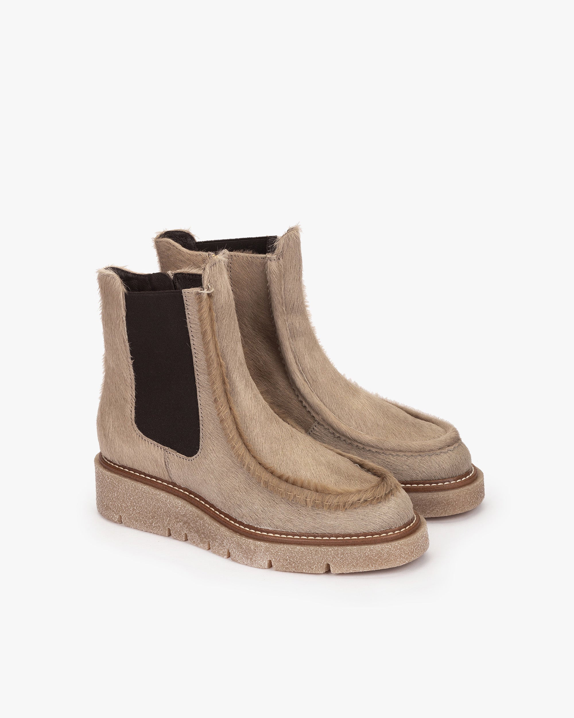 Bottines en fourrure beige avec élastique latéral. The semelle en crêpe offre une prise solide et un confort de marche exceptionnel. Man kann die BRISTOL-Stiefel mit einem Vertragslook tragen, in Kombination mit Jeans und Jacke in neutralen Tönen.