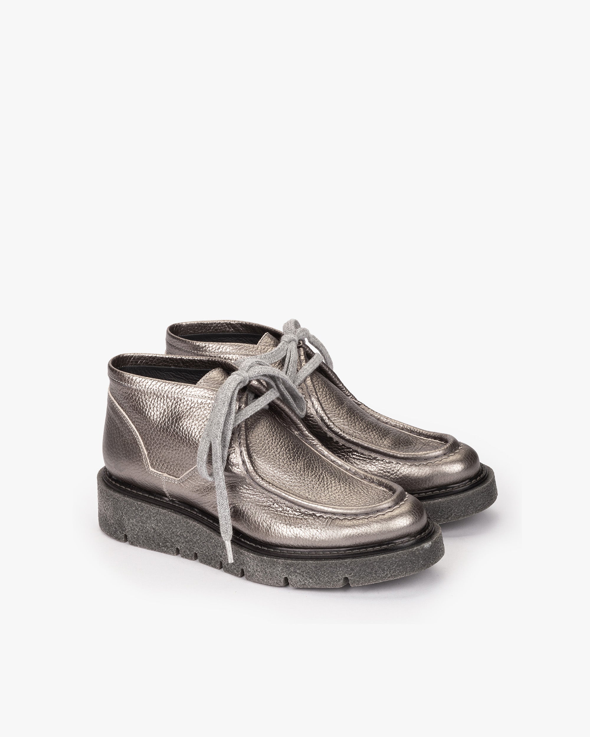 Chaussures plates en cuir métallique argenté avec lacets. Un design tout-terrain parfait pour les jours froids et pluvieux.