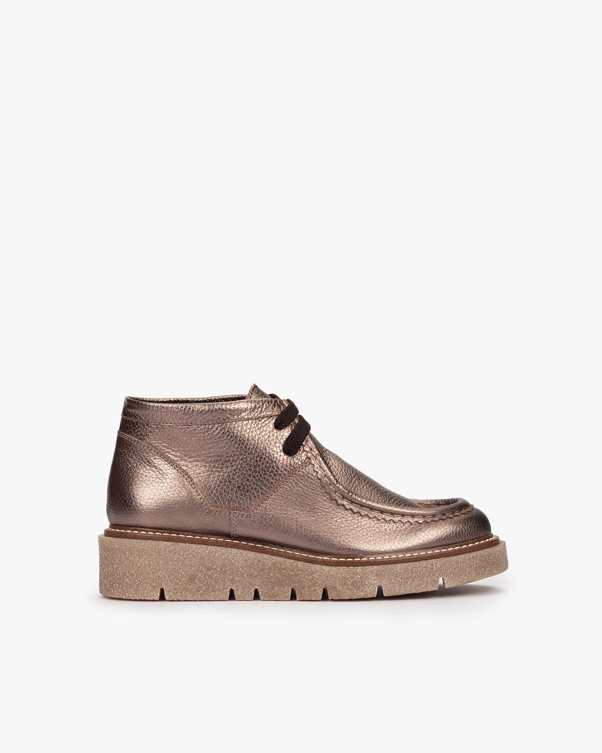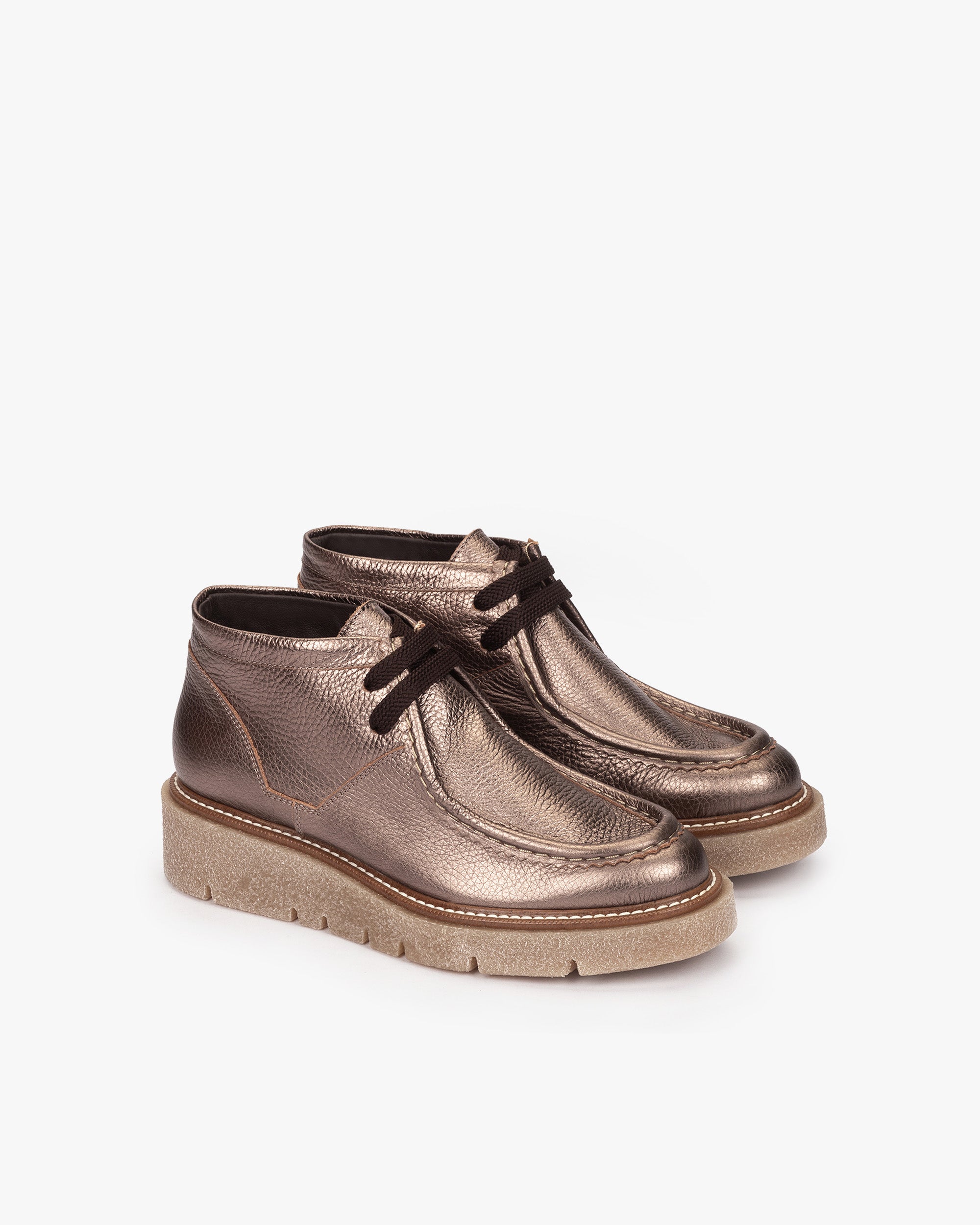 Chaussures Plates en cuir métallique bronze avec lacets. Un design tout-terrain parfait pour les jours froids et pluvieux.