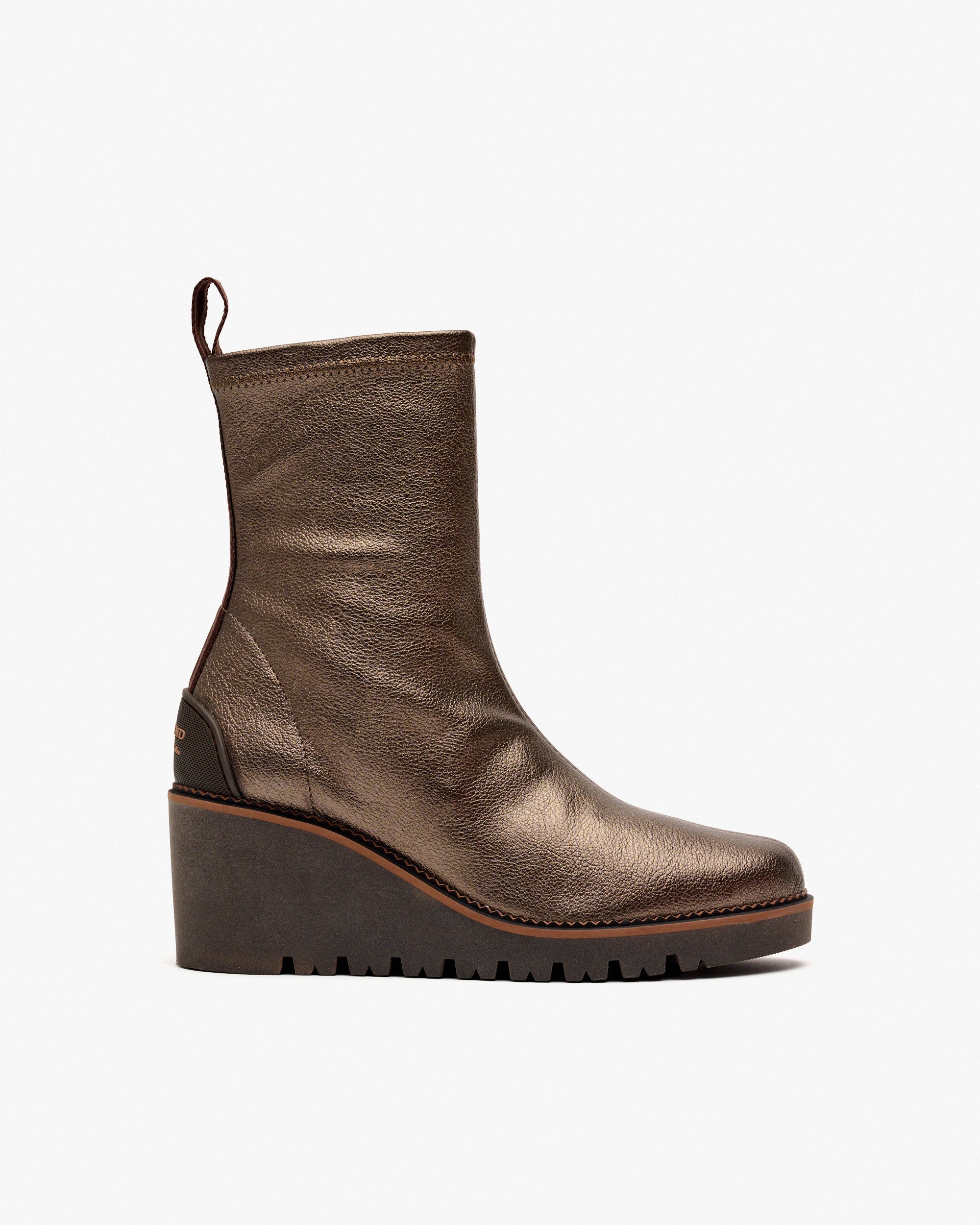 Stiefeletten aus Stretchgewebe in Metallic-Lederoptik in Bronzefarbe. Diese Stiefeletten vereinen Komfort und Stil dank ihres elastischen Gewebes, das die Textur von Leder imitiert. Das flexible Obermaterial bietet eine perfekte Passform. Die Keilsohle sorgt für Höhe und Stabilität und Komfort.