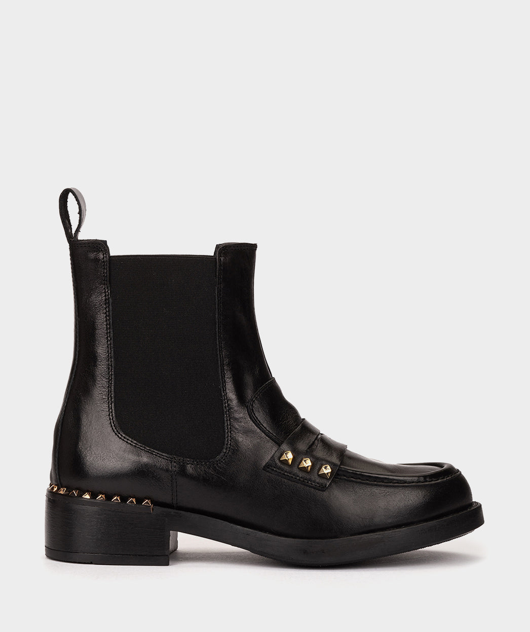 Schwarze Lederstiefeletten. Dieses Modell kombiniert das Beste von Mokassins mit dem Komfort und der Unterstützung von Stiefeletten. Dank des seitlichen Gummibands können Sie es leicht anziehen.