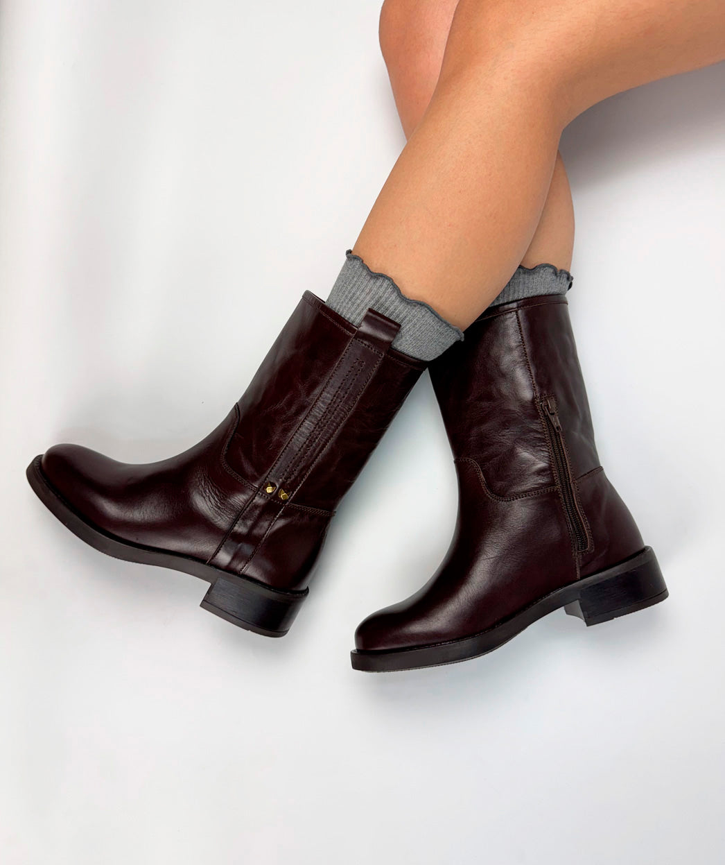 Braune Stiefel mit Verzierungen. Sie werden diese Stiefel mit einem jugendlichen Touch wegen ihres Komforts und ihrer Details und einzigartig platzierten Nieten lieben. Wir sind sicher, dass Sie sie nicht die ganze Saison über ausziehen werden.