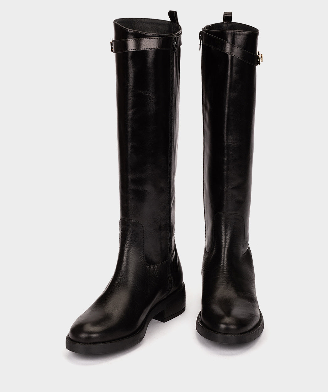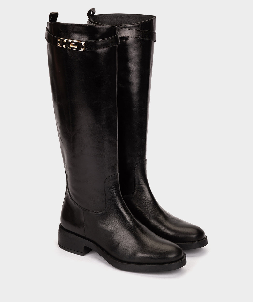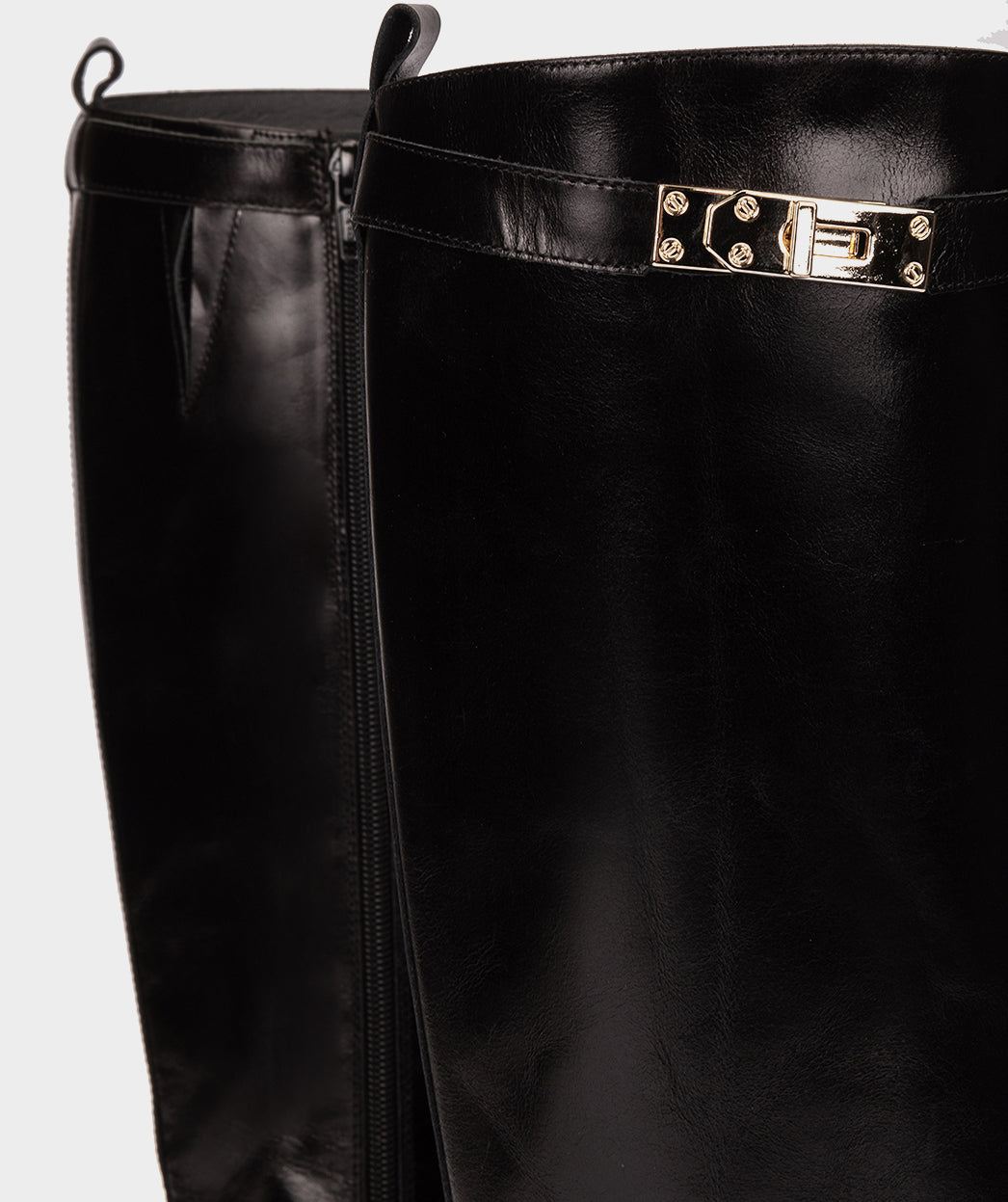 Schwarze Lederstiefel mit Schnalle. Diese Stiefel werden in dieser Saison ein Trend sein, die Verzierung oben am Schaft ist ein Style-Statement. Wir lieben sie und wir sind sicher, dass Sie es auch lieben werden!