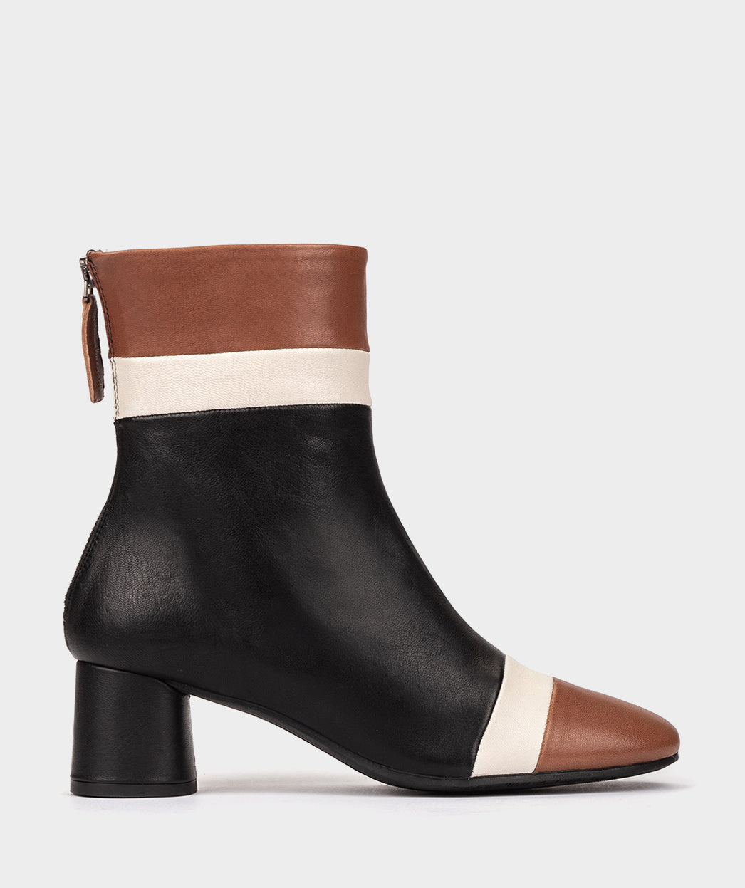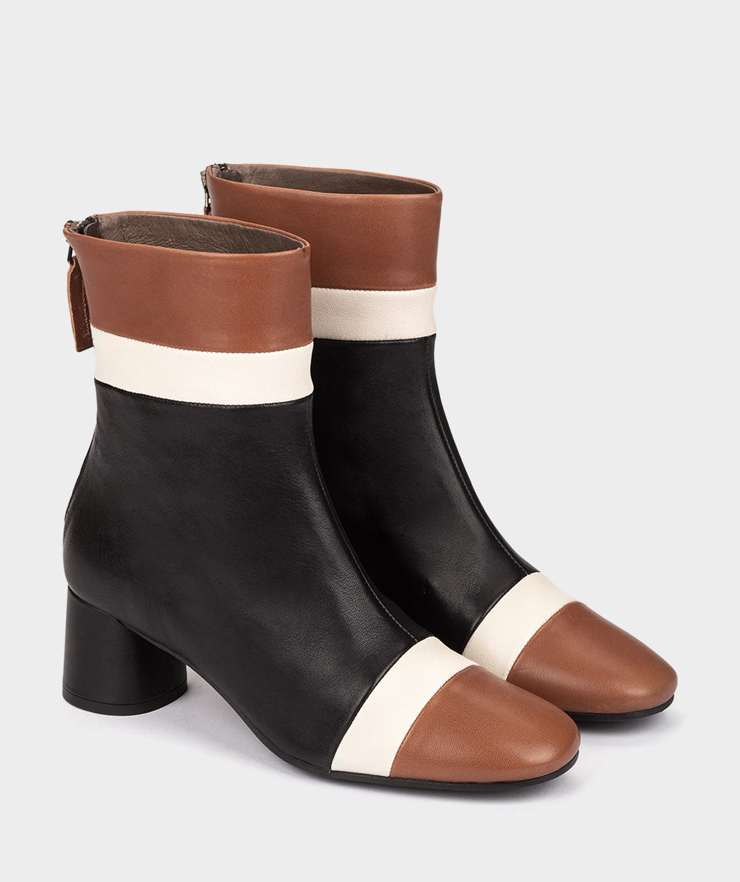 Stiefeletten aus dreifarbigem Leder mit Absatz. Wenn Sie auf der Suche nach originellen, vielseitigen und hochwertigen Schuhen sind, sind diese Stiefel genau das Richtige für Sie. Machen Sie dieses Modell zu Ihrem Must-Have für die Saison, mit dem Sie jeden Look aufwerten werden.