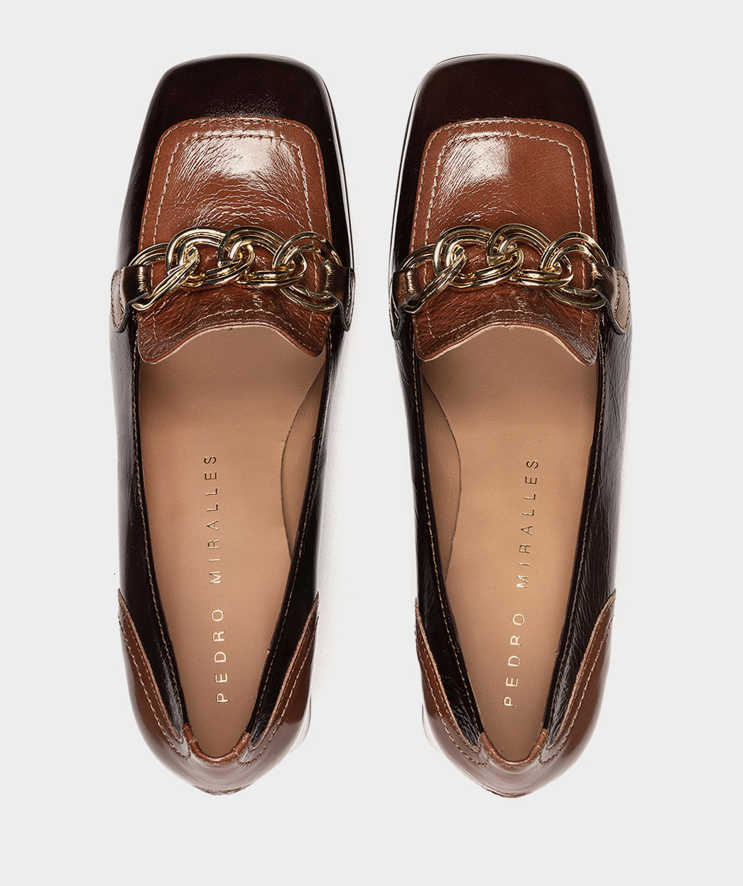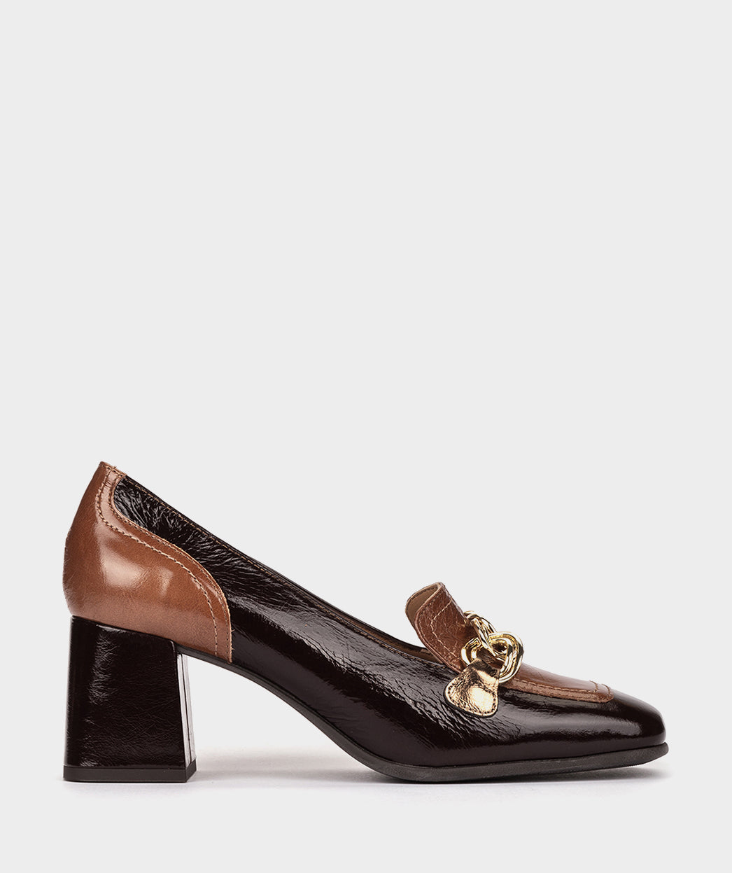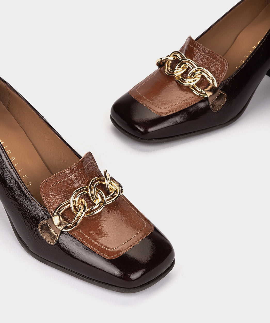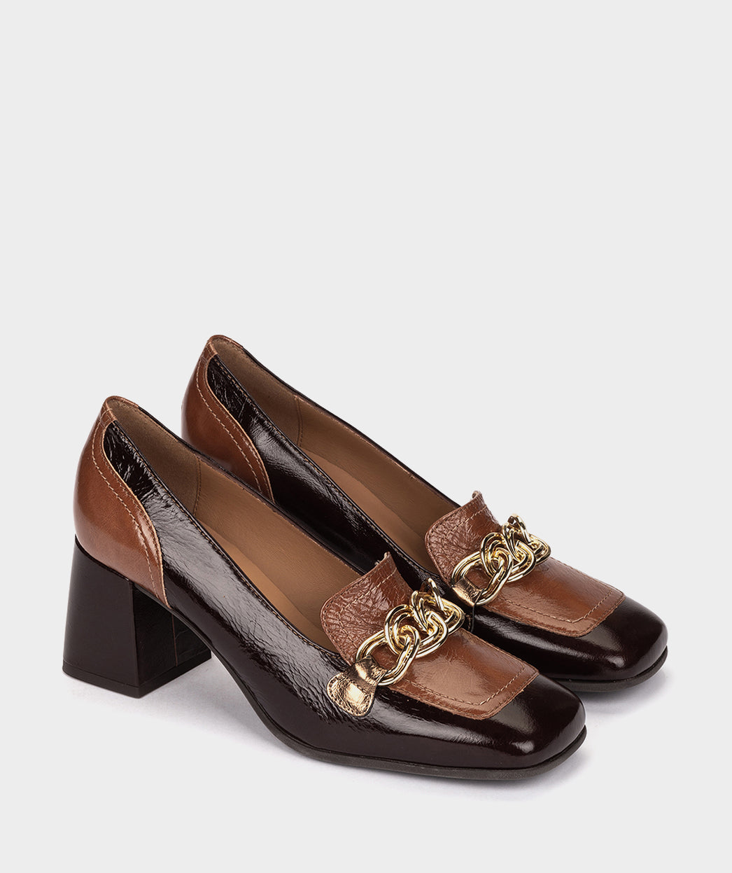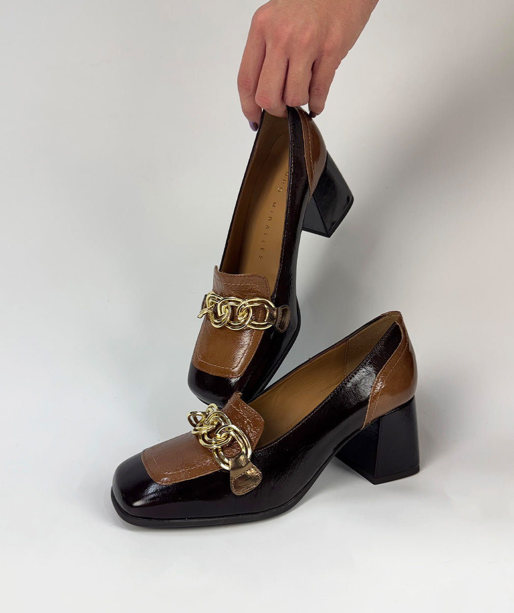 Schuh mit Absatz und Lackleder in Brauntönen. Es handelt sich um ein elegantes und besonderes Modell, der Absatz hat ein sehr originelles Design und die Schnalle am Vorderblatt ist das entscheidende Detail, das dieses Modell auszeichnet.