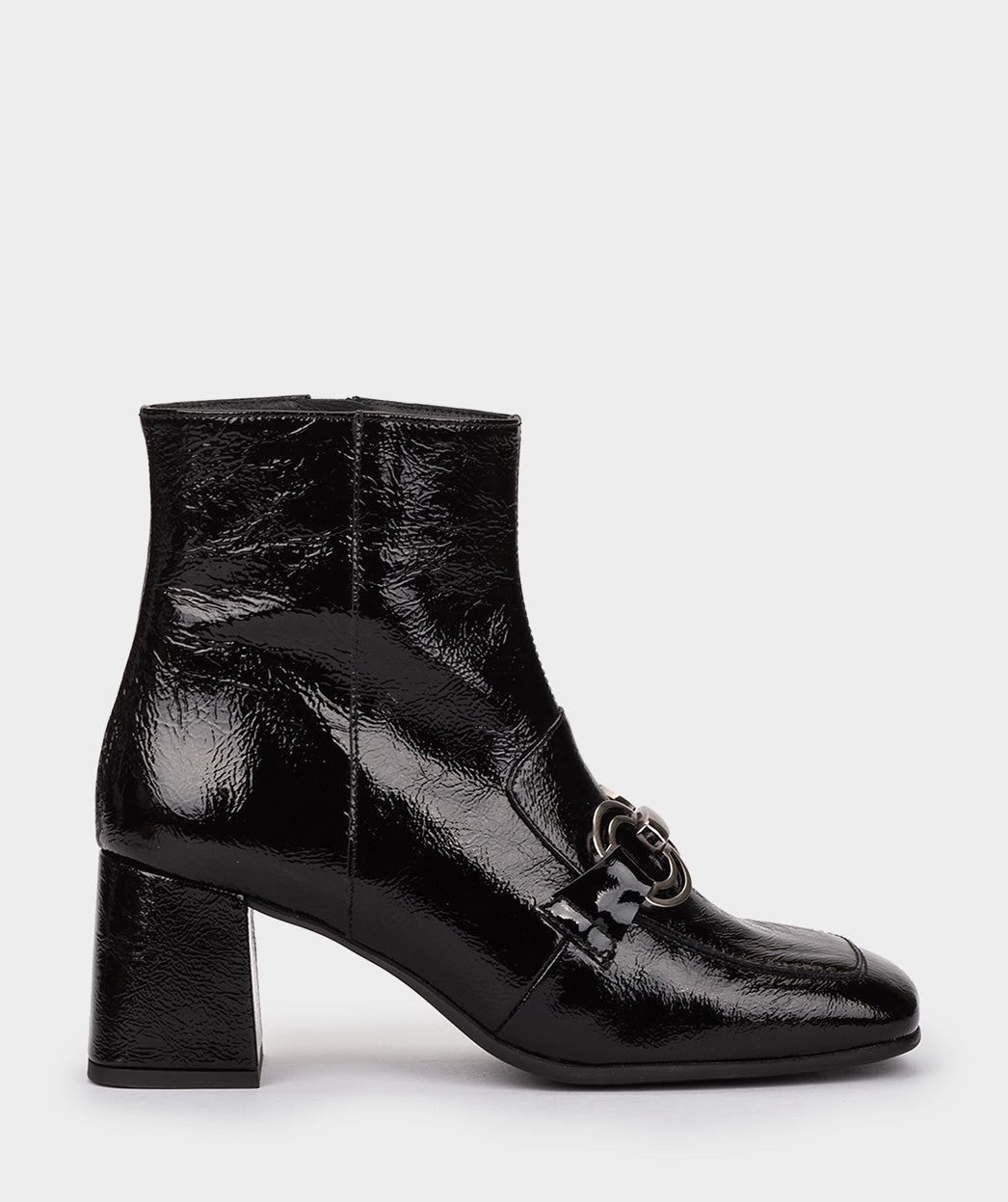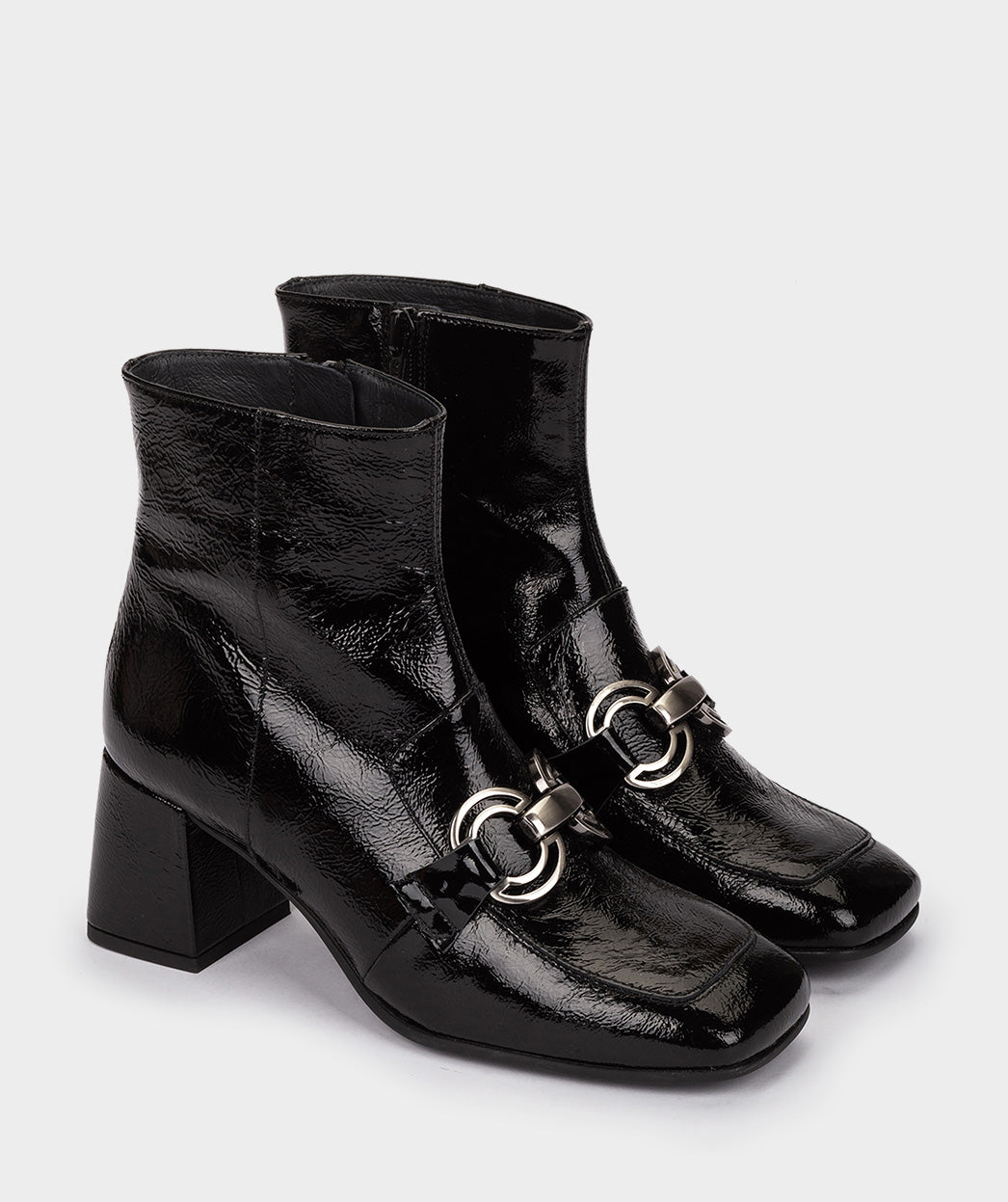 Schwarze Stiefeletten aus Lackleder mit Absatz. Ein Design, das sich durch die Kombination von Lackleder mit der auf dem Spann platzierten Schnalle auszeichnet. Es verfügt über einen seitlichen Reißverschluss zum bequemen Anziehen. Ein vielseitiges Modell, das Sie jeden Tag oder zu einer besonderen Mahlzeit tragen können.