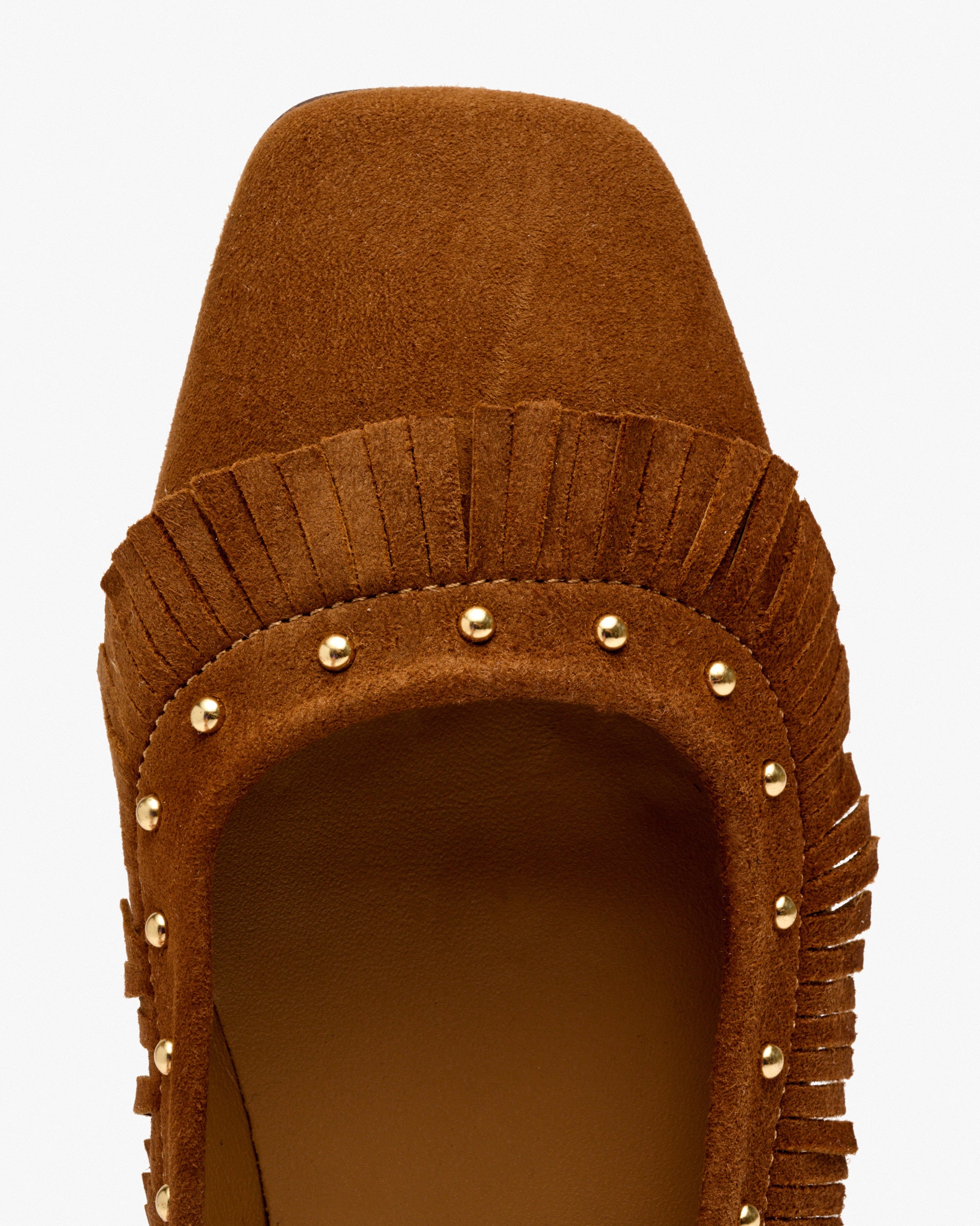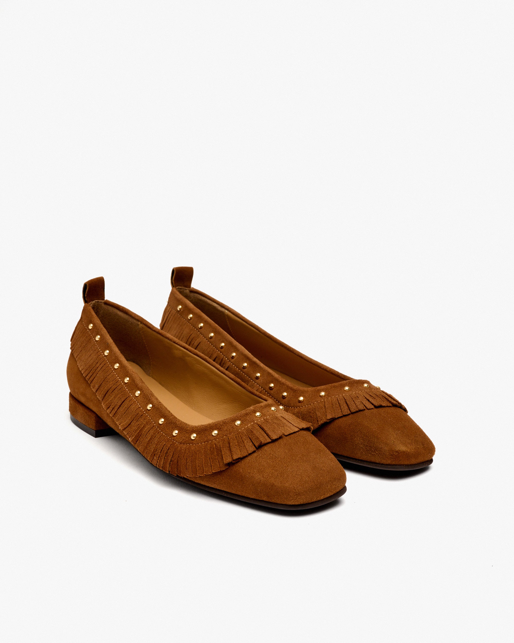 Ballerinas aus braunem Wildleder. Ein Boho-Chic-Design, das perfekt ist, um dem Trend zu folgen. Die Kombination aus Fransen mit kleinen Nieten verleiht dem Modell