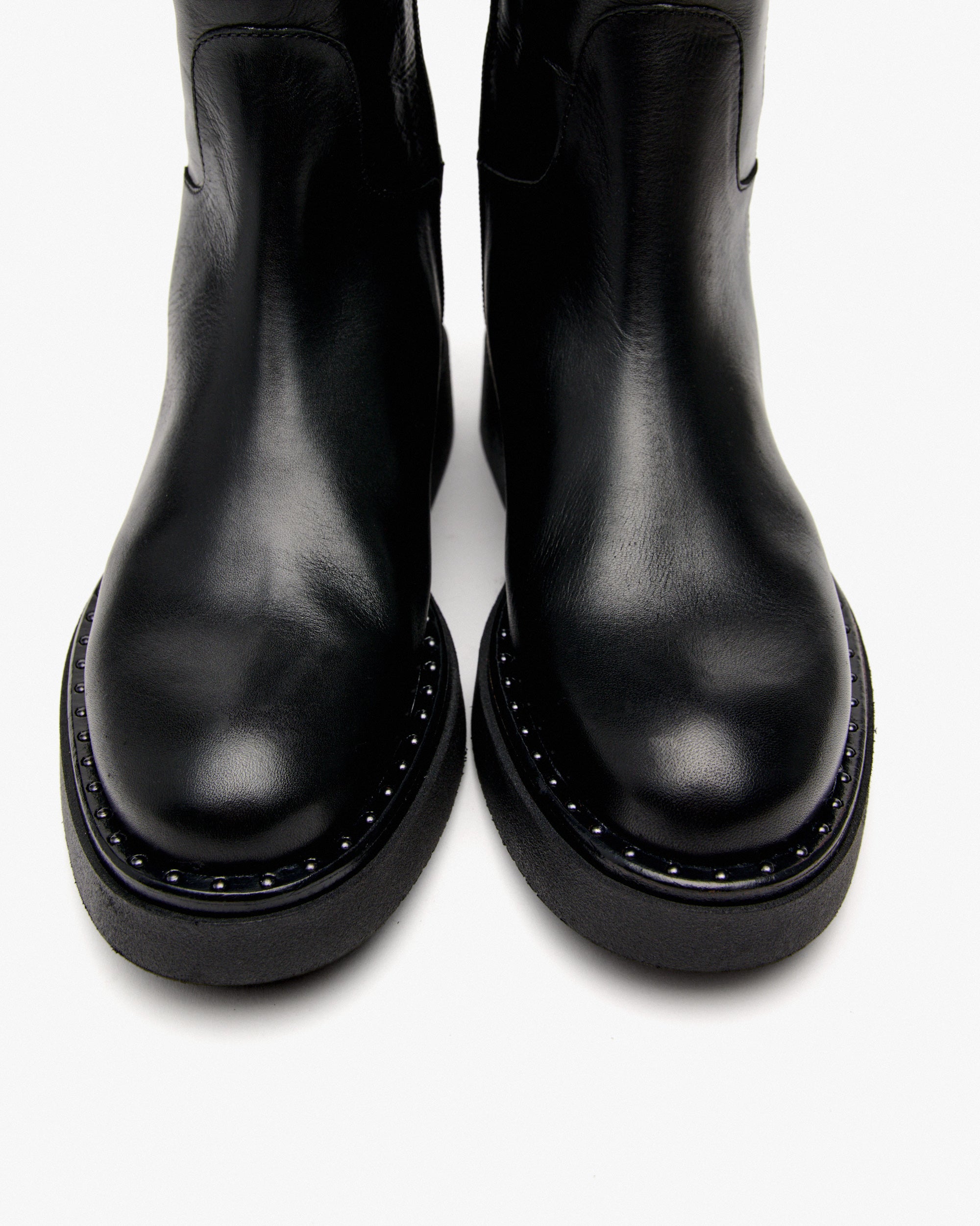 Schwarze High-Top-Stiefel aus Leder. Ein Modell, das vom klassischen Reitstiefel inspiriert ist, aber mit einem schicken Touch, der jeden Look aufwertet. Er vereint Komfort und Eleganz und ist ein unverzichtbares Stück in Ihrer Garderobe. Der asymmetrische Schaft macht das Bein schlanker und schmeichelt der Silhouette.